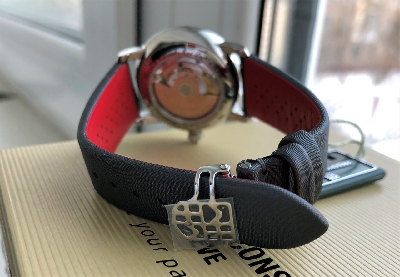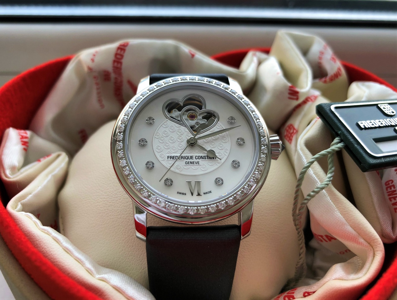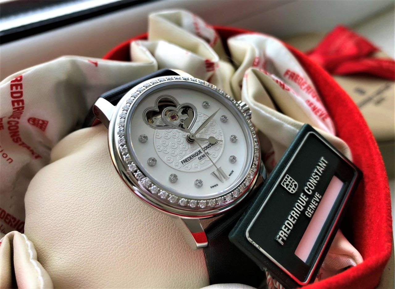 Открытый баланс хода в виде двух соединяющихся сердец, россыпь бриллиантов, элегантный черный сатиновый ремешок.