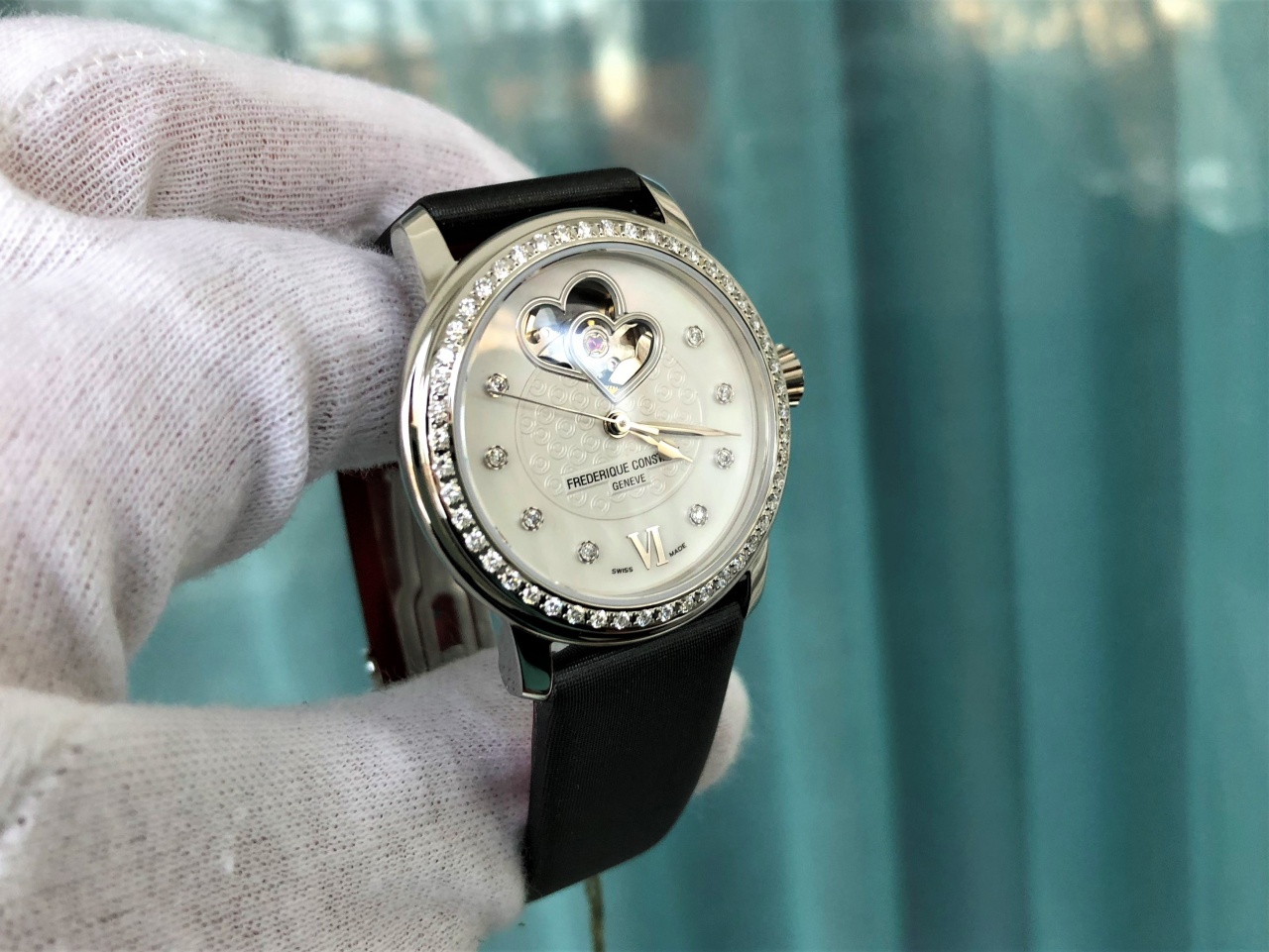 Оформление: С бриллиантами, перламутровый циферблат гильоше, открытый баланс хода, механизм содержит 26 камней