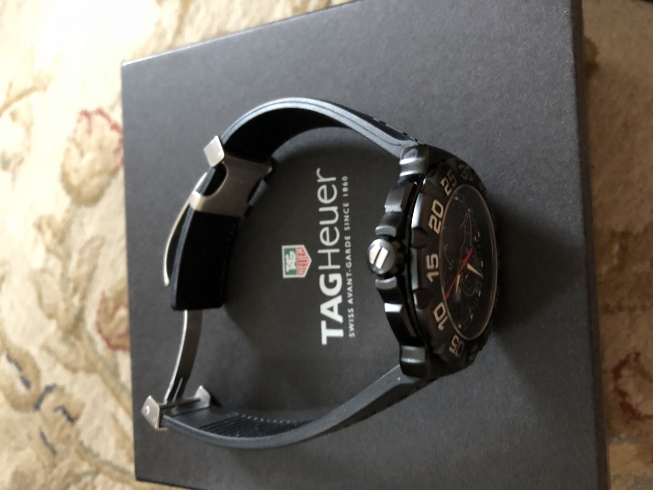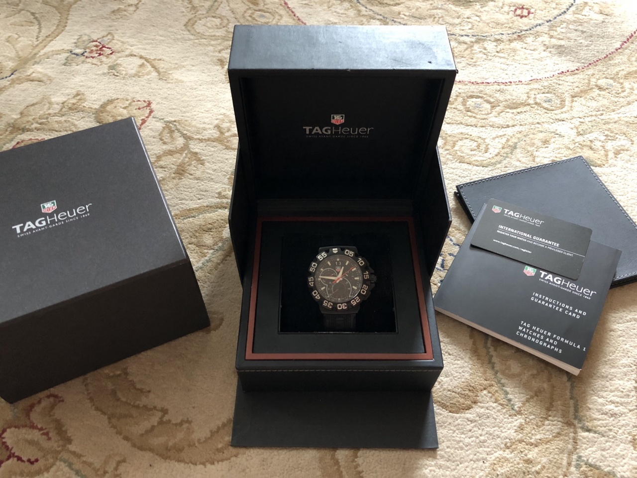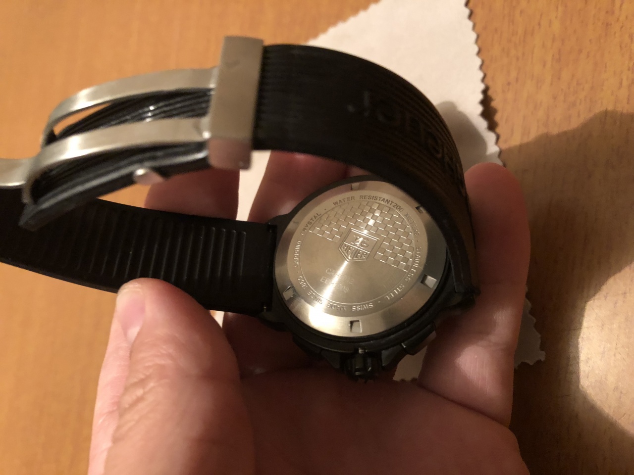 Grande-Date Chronograph. Калибр: Ronda 5040B. Часы, минуты, секунды, дата, хронограф, тахометр, функция EOL. Вращающийся в одну сторону безель с устойчивым к царапинам титан-карбидным покрытием. Циферблат: наложенные вручную часовые метки, граненые часовая и минутная стрелки со светящимися в темноте вставками,стреловидный наконечник на секундной стрелке. Окошко даты с граненой рамкой в позиции "3 часа". Коронка: завинчивающаяся коронка "Easy Grip" с устойчивым к царапинам титан-карбидным покрытием и полуматовым рельефным логотипом TAG Heuer. Завинчивающаяся заводная головка. Сапфировое стекло, устойчивое к царапинам. Корпус из высококачественного стального сплава 316L с высокими антикоррозийными свойствами. Корпус с полным PVD покрытием черного цвета. Размеры корпуса: диаметр 44 мм, толщина 12,5 мм. Люминесцентные стрелки и метки. Вес: 114 гр.