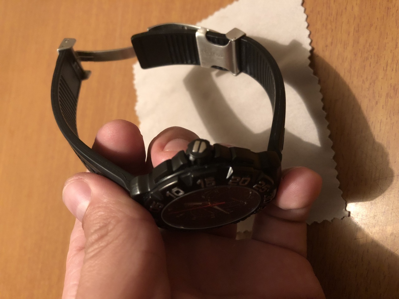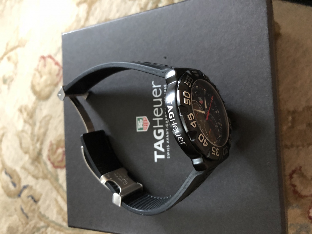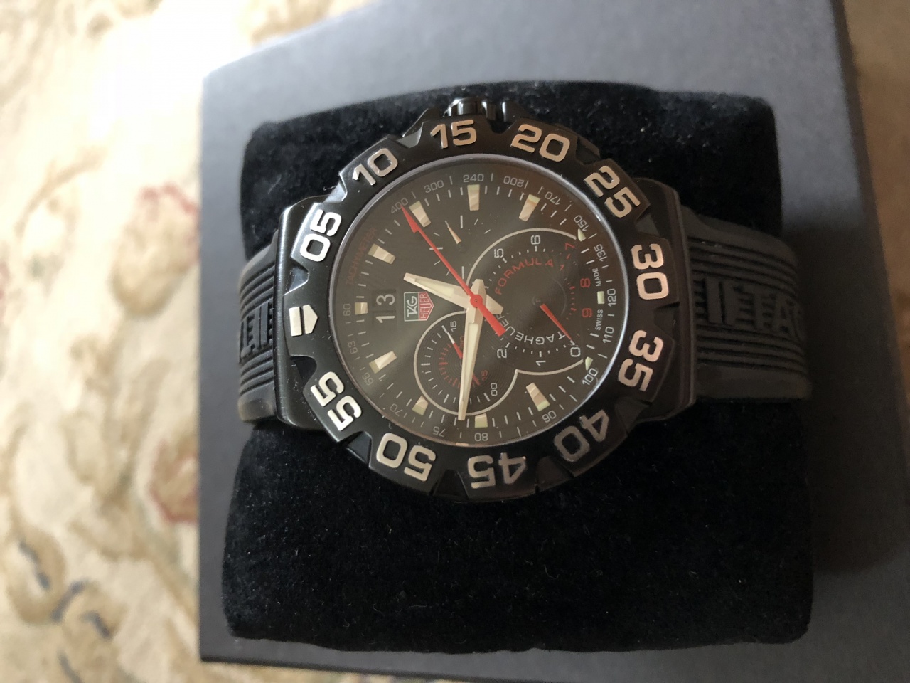 Grande-Date Chronograph. Калибр: Ronda 5040B. Часы, минуты, секунды, дата, хронограф, тахометр, функция EOL. Вращающийся в одну сторону безель с устойчивым к царапинам титан-карбидным покрытием. Циферблат: наложенные вручную часовые метки, граненые часовая и минутная стрелки со светящимися в темноте вставками,стреловидный наконечник на секундной стрелке. Окошко даты с граненой рамкой в позиции "3 часа". Коронка: завинчивающаяся коронка "Easy Grip" с устойчивым к царапинам титан-карбидным покрытием и полуматовым рельефным логотипом TAG Heuer. Завинчивающаяся заводная головка. Сапфировое стекло, устойчивое к царапинам. Корпус из высококачественного стального сплава 316L с высокими антикоррозийными свойствами. Корпус с полным PVD покрытием черного цвета. Размеры корпуса: диаметр 44 мм, толщина 12,5 мм. Люминесцентные стрелки и метки. Вес: 114 гр.