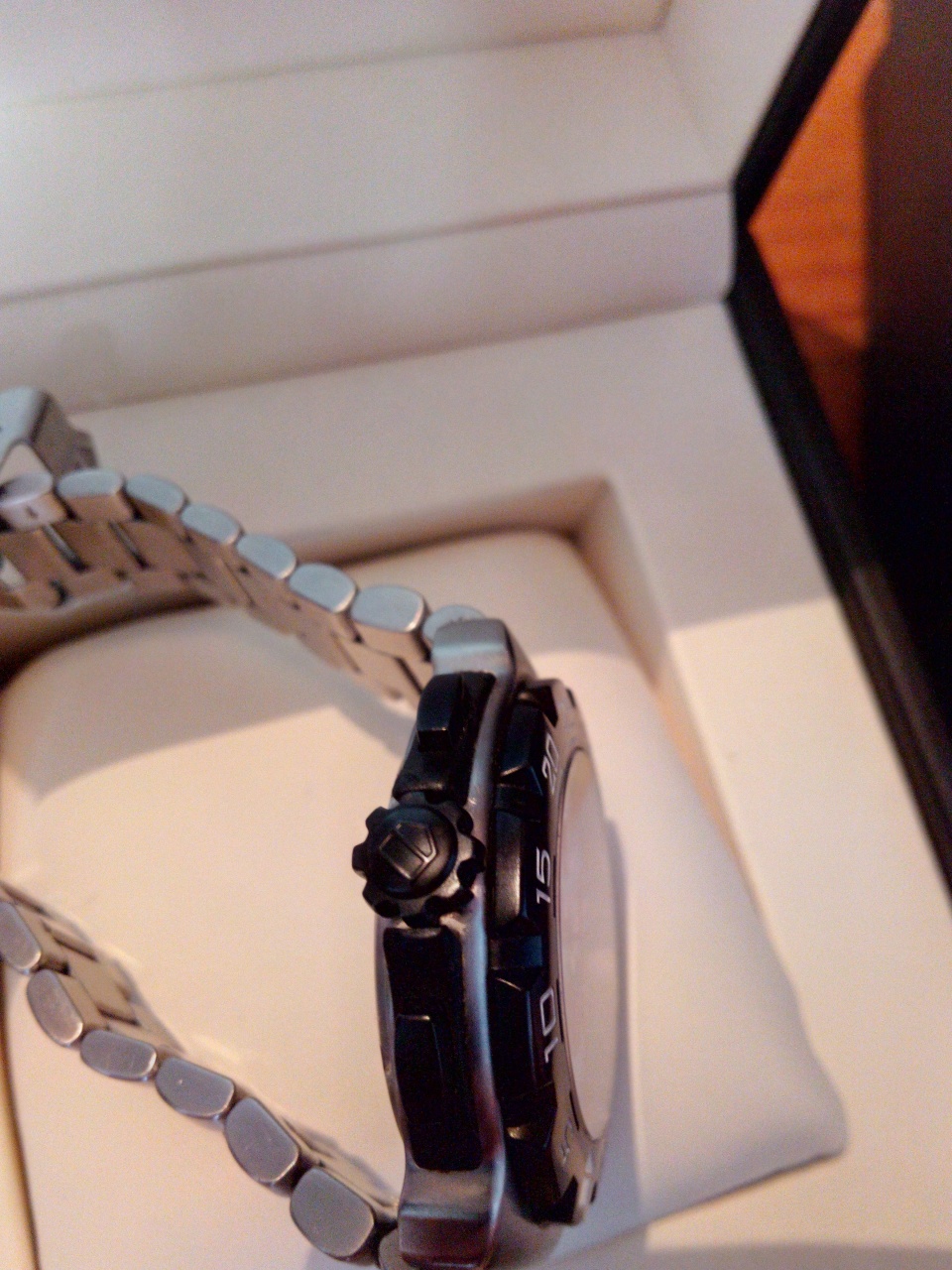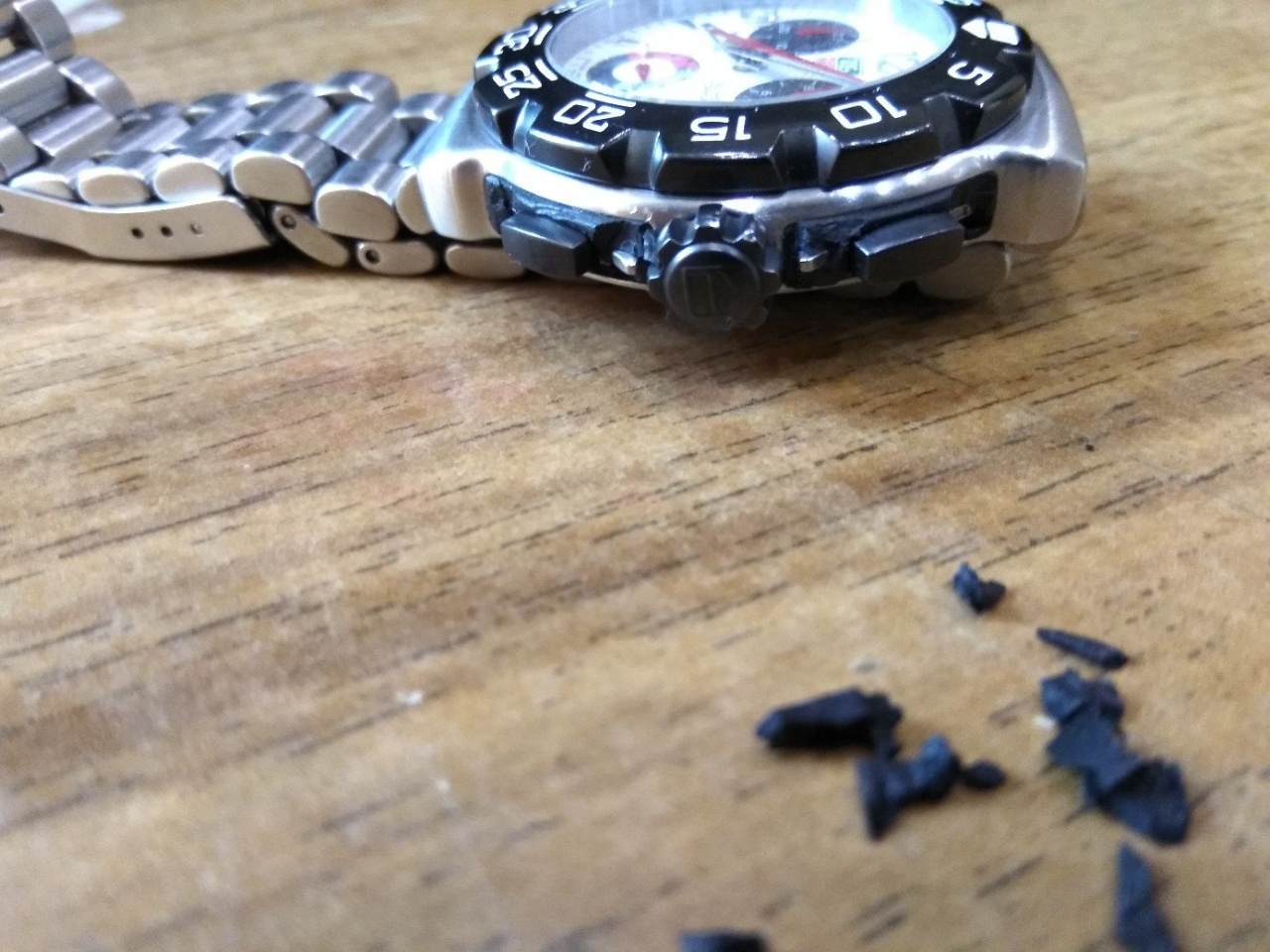 Принёс домой, произвёл замену кожаного ремешка на родной браслет, затем решил выставить время и тут произошло самое интересное - когда я начал выкручивать заводную головку, резина окружающая кнопки управления хронографом стала крошиться, от малейшего касания, подобно высохшему пластилину.