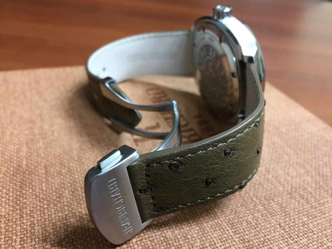 Часы поставляются на бронзовом ремешке, выполненном из кожи страуса, идеально соответствующем циферблату.