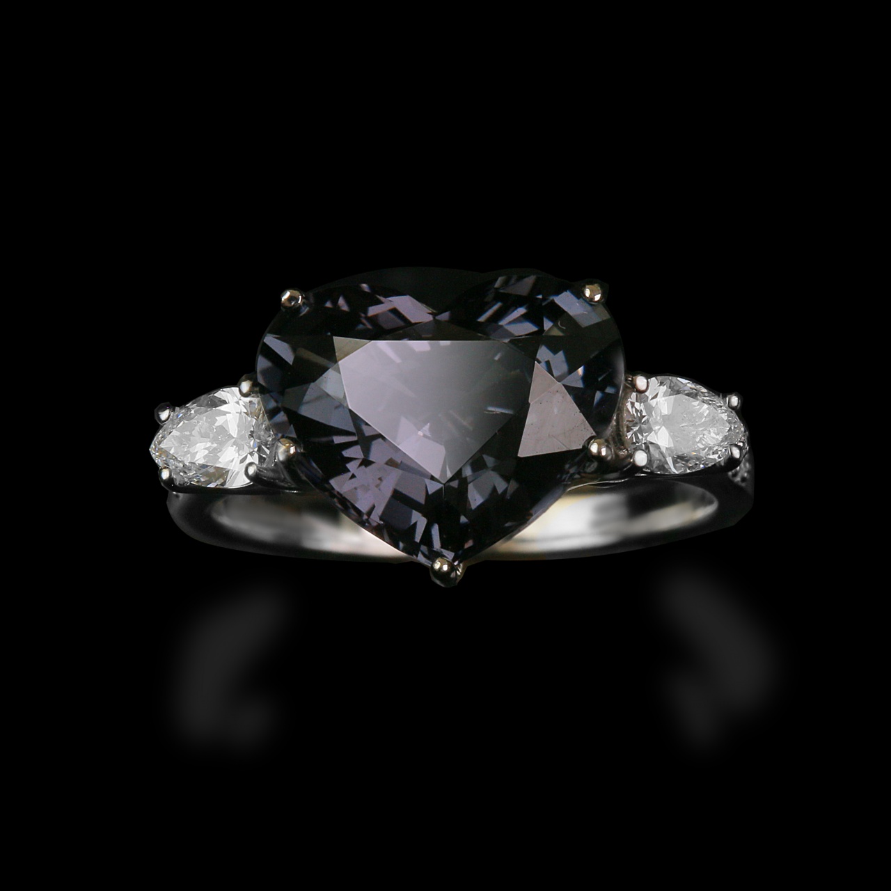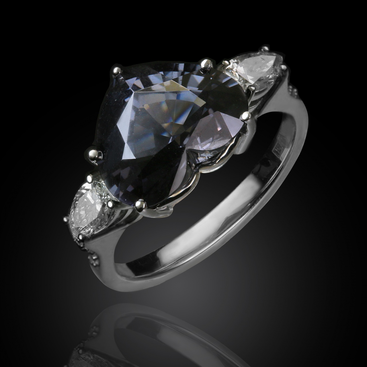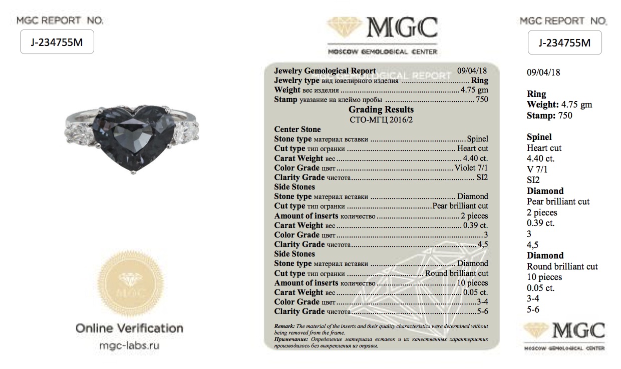 Кольцо из белого золота со шпинелью 4,40 карат и бриллиантами 0,44 карат (сертификат МГЦ)