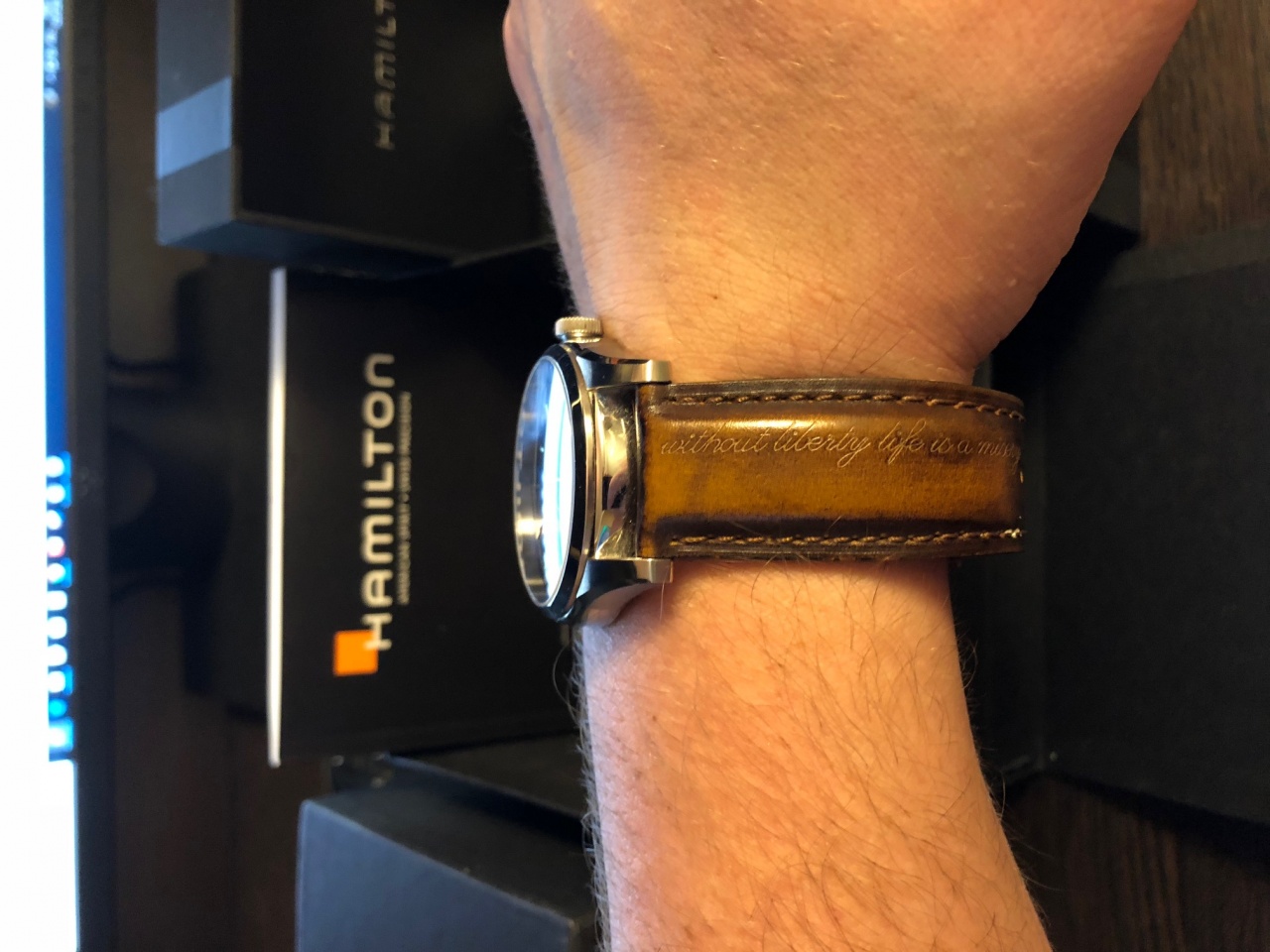 Визитная карточка Spirit of Liberty — безусловное внимание к деталям, создающее прочную связь между историей и современностью. Механизм H-10 с 80-часовым запасом хода и эксклюзивное оформление со скелетонизированным ротором в часах Hamilton придают современный колорит традиционному точному измерению времени.