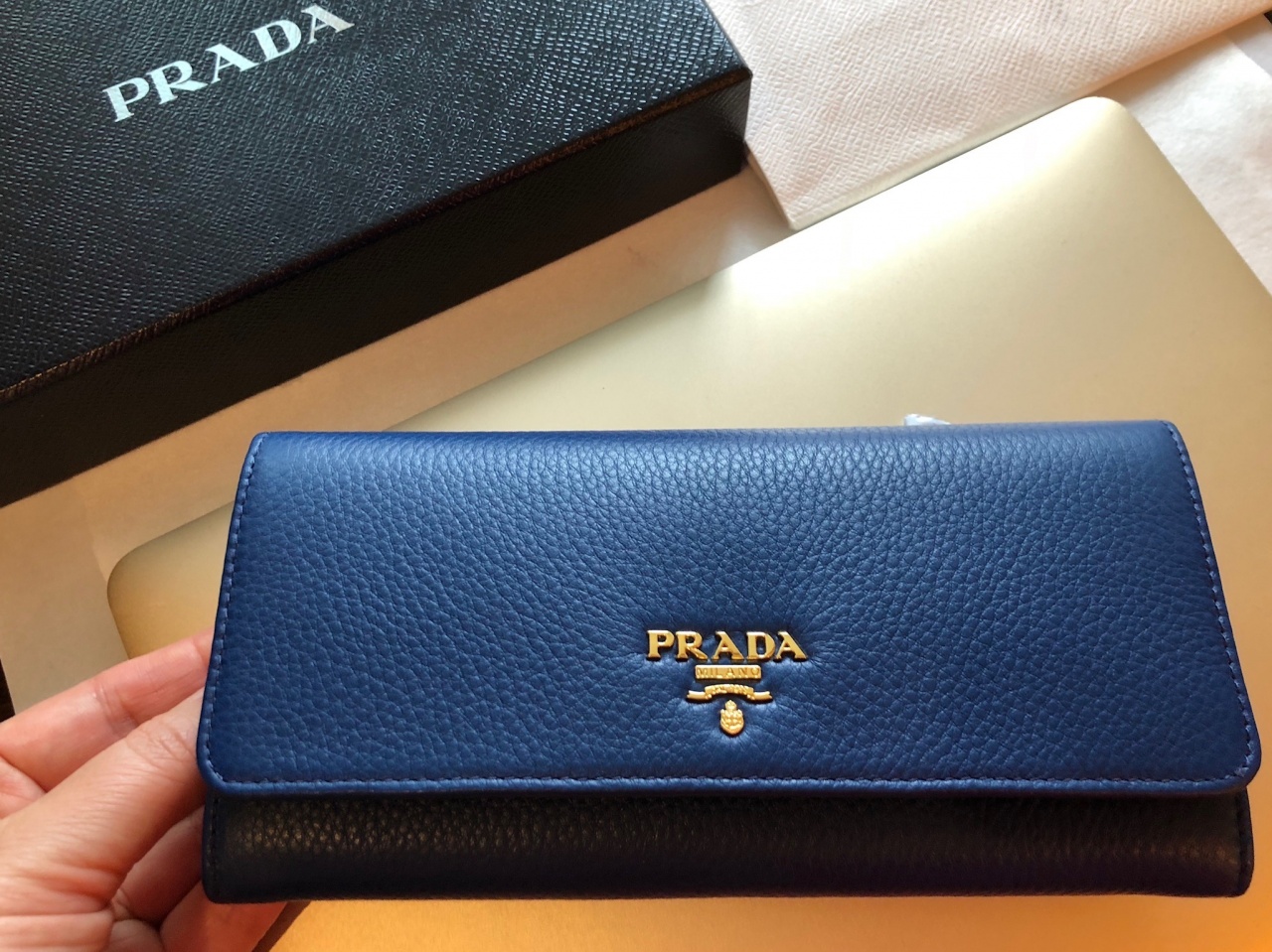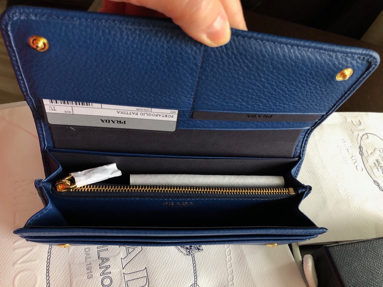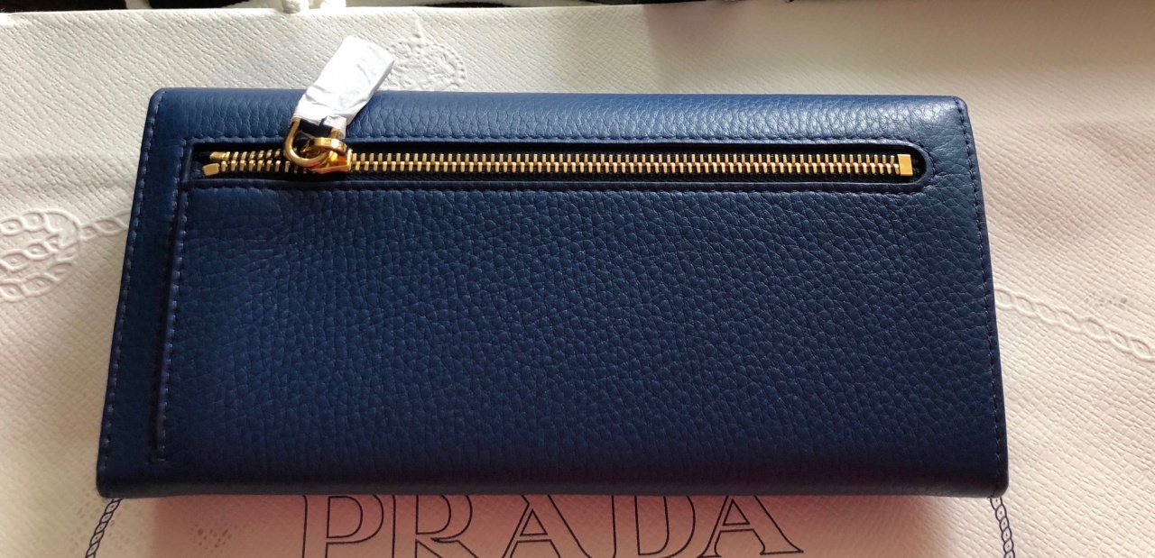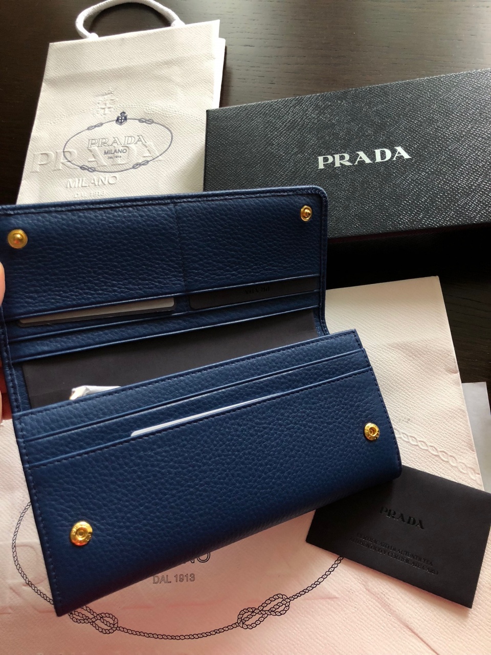 Коллекция 2017-2018 года, со встроенными визитницами, которые у PRADA отдельно стоят не менее 8-12т.р. Мягкая зернистая кожа, выделки VITELLO GRAIN, очень ноская и стойкая к царапинам. Портмоне полноценного формата, 19см на 9,5см. Насыщеного темно-синего цвета Bluette, с золотым металическим лого на клапане.