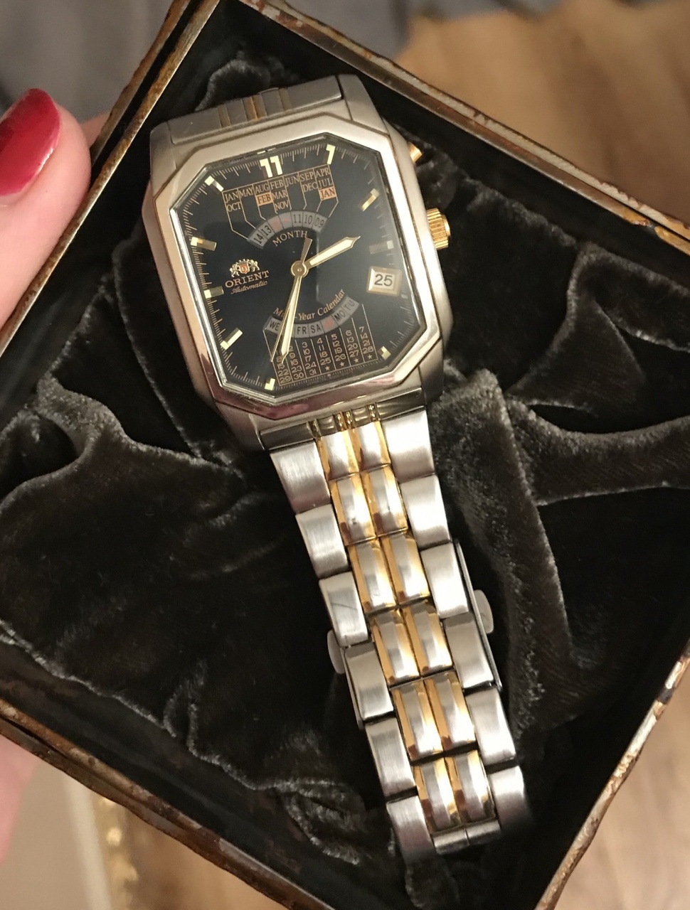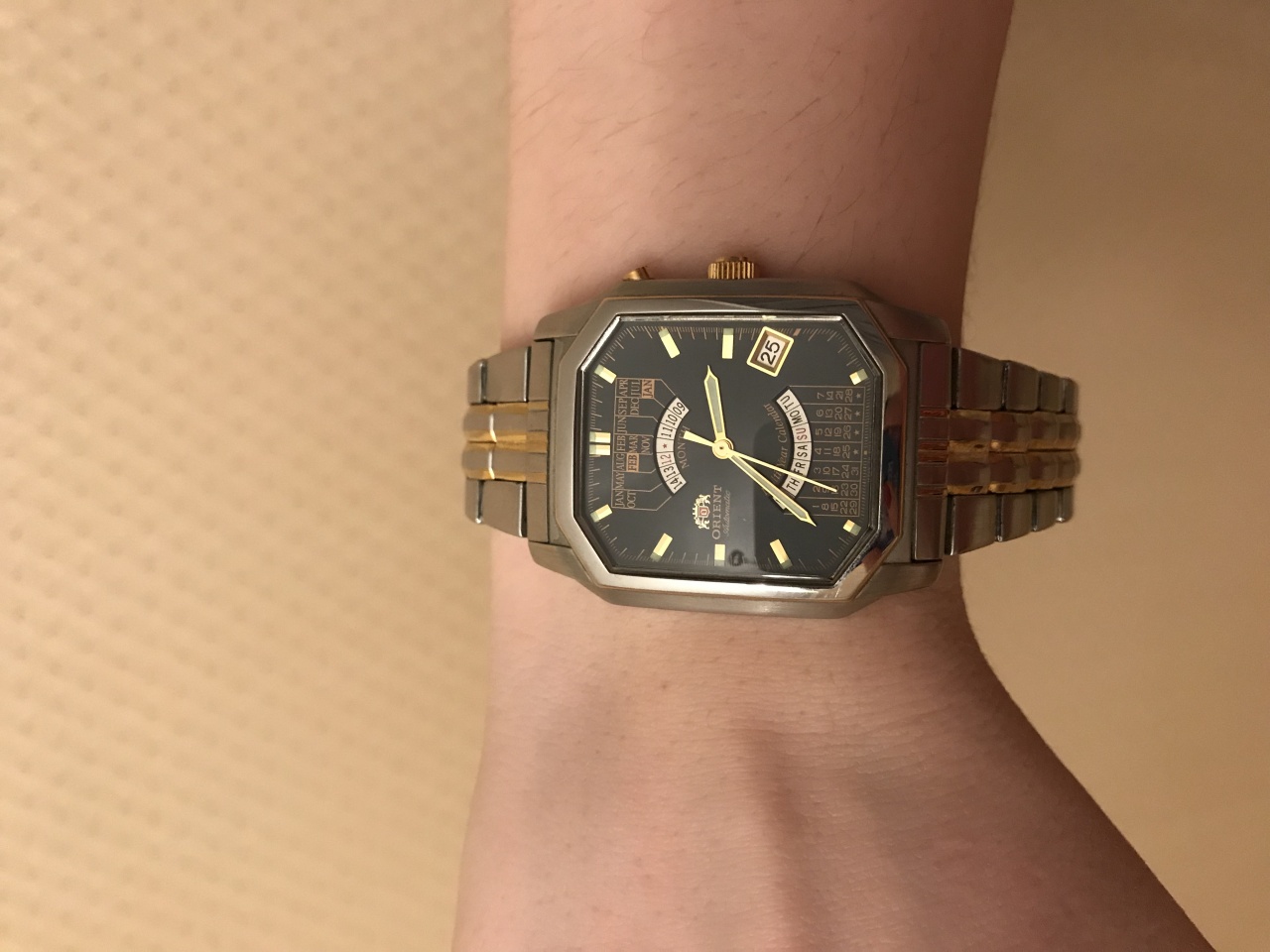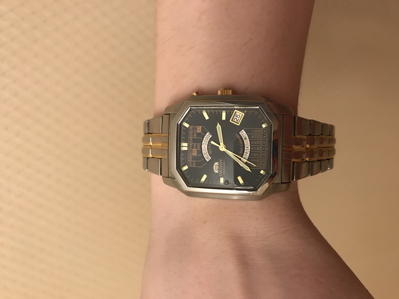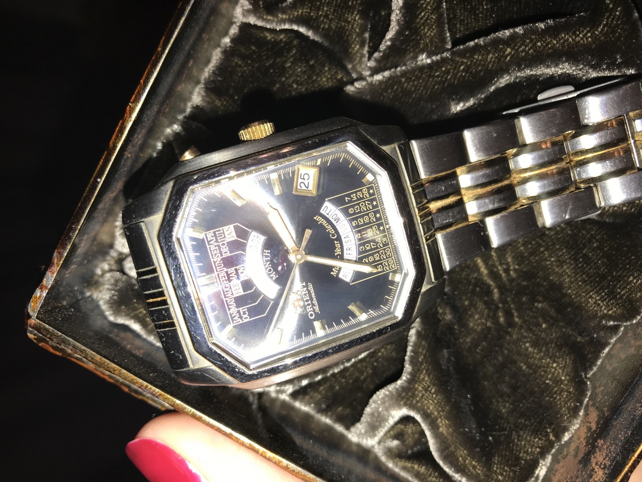 Часы дарили мужу, не носил их практически, все работает хорошо, но коробка и документы утеряны. Не настроены календари, т.к. Часы механические, без постоянной носки останавливаются и все сбрасывается.
