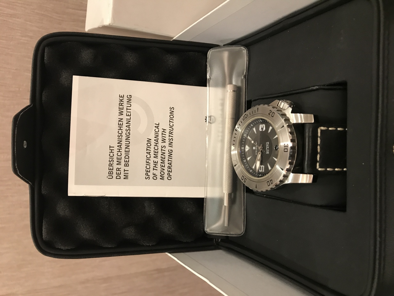 Неубиваемый ETA 2824-2 с автоподзаводом. Часовая и минутная стрелки с люминесцентным покрытием, корпус из нержавеющей стали, задняя крышка - завинчивающаяся, с красивой гравировкой, сапфировое стекло, с двойным с антибликовым покрытием, однонаправленный безель на 120 положений, накладные, серебристые метки, с покрытием Super-LumiNova BG W9. Диаметр: 45 мм. Толщина: 14 мм. Вес: 158 г. Водонепроницаемость: 300 м.