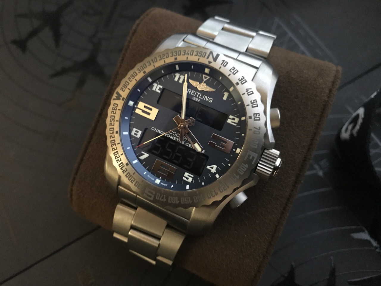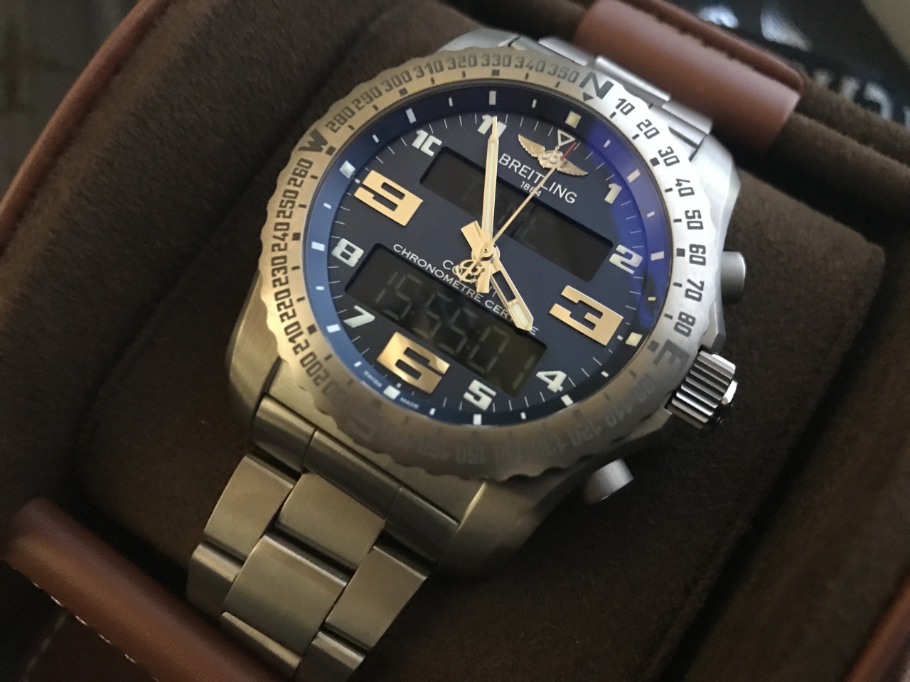 Уважаемые форумчане, в продаже многофункциональный электронный хронограф от BREITLING в титановом корпусе с великолепным темно-синим циферблатом. Часы оснащены эксклюзивным электронным мануфактурным калибром Breitling B50 с аналоговым и цифровым дисплеями. В число его инноваций также входит облегчающий восприятие информации дисплей, высочайшая простота в обращении и широкий набор функций