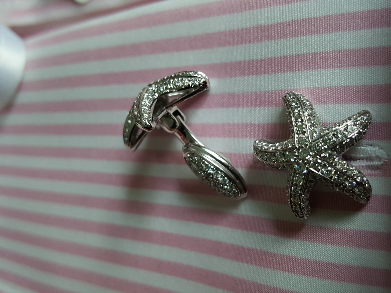Запонки изготовлены в стилизованном виде "морской звезды", пять лучей-щупалец которой усыпаны бриллиантами.