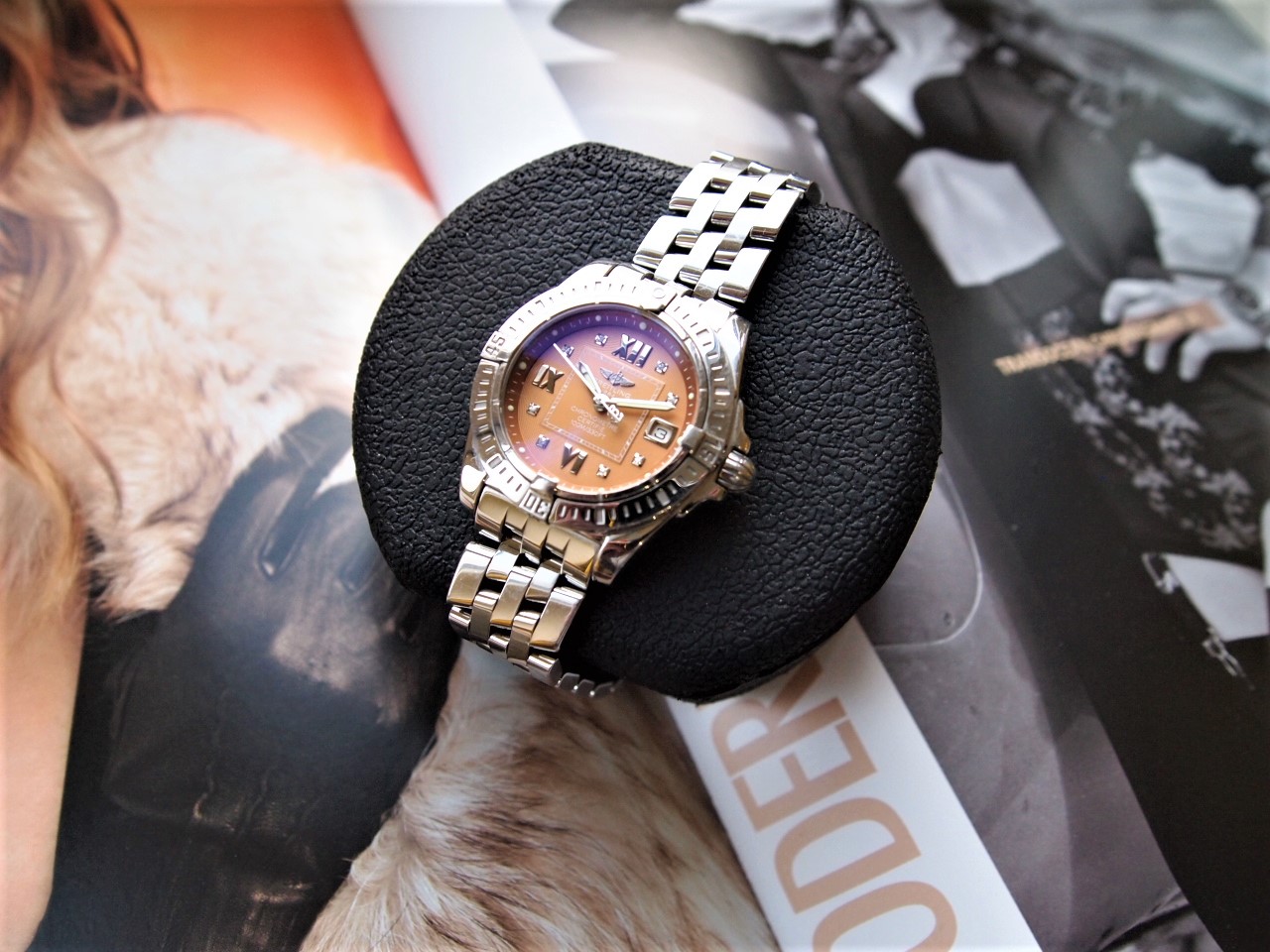 Корпус полностью повторяет очертания старших братьев от знаменитого производителя - Chronomat, но меньшего размера 32 мм и специально для девушек, циферблат украшен крупными бриллиантами.