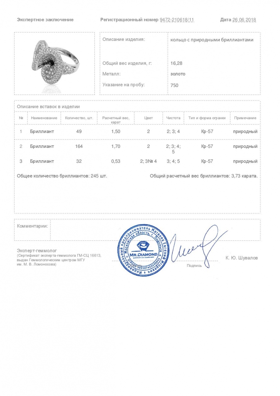 Великолепное золотое кольцо с бриллиантами 3.73ct