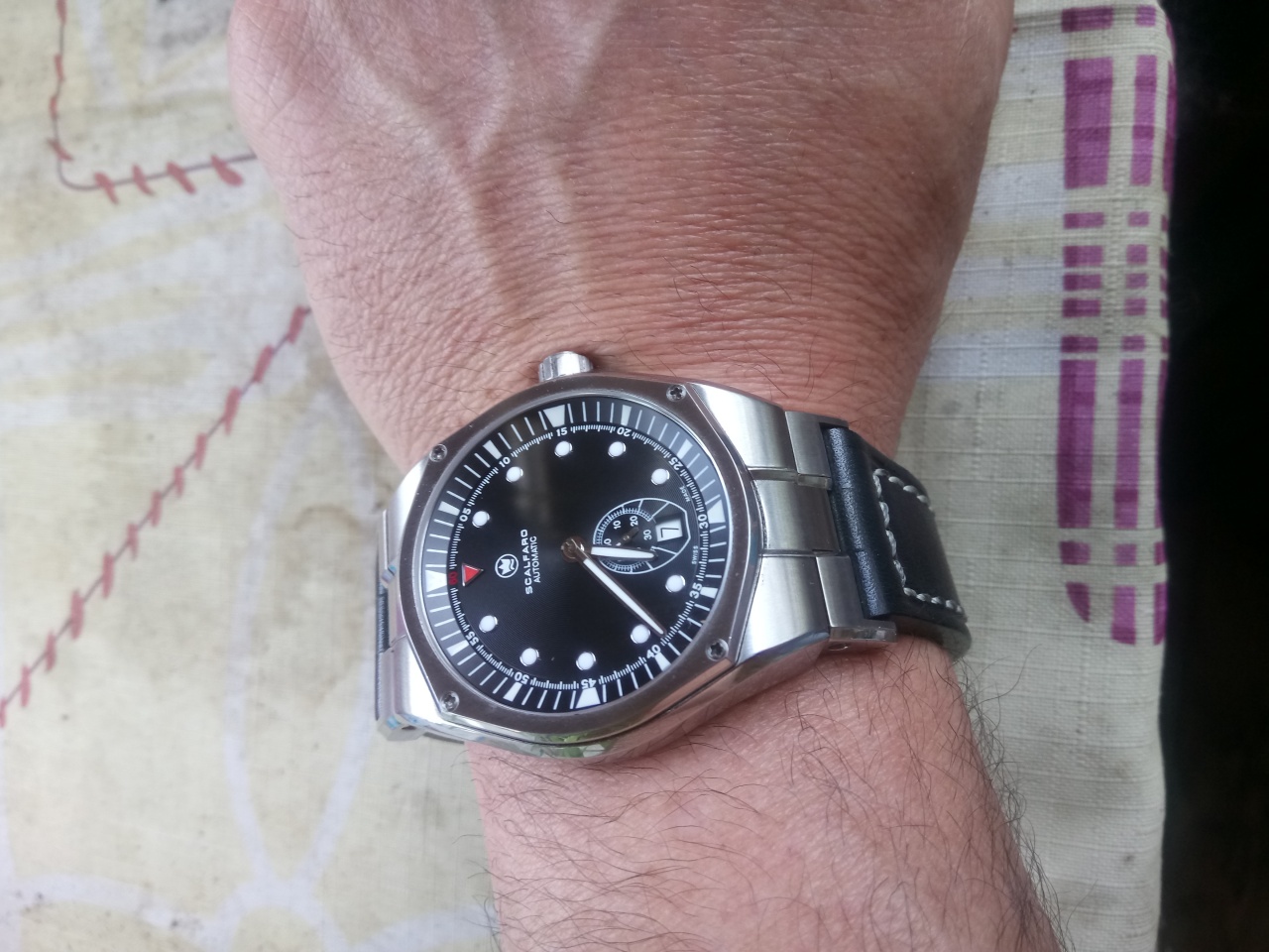 Отличные часы на механизме ETA 2895-1, если кто не знает, это вариация ETA 2892 с малой секундной стрелкой. Диаметр 43 мм, дата, стопсекунда, хороший люм, стекло - плоский сапфир с антибликом, задняя крышка прозрачная, водозащита 100м, ЗГ завинчивающаяся.. Отделка механизма на уровне (постарался показать на фото перлаж). Часы в состоянии честного АА. Я купил их в состоянии новых, я единственный владелец и носил из около 3 недель аккуратно каждый день. На ремешке есть следы носки, на самих часах никаких следов вообще нет. К часам прилагается коробка. Технически все безупречно, ход примерно +4,5 сек/сут, как и полагается новому механизму. Судя по рефу, часы выпущены несколько лет назад (погуглите, вот ссылка на оф. сайт