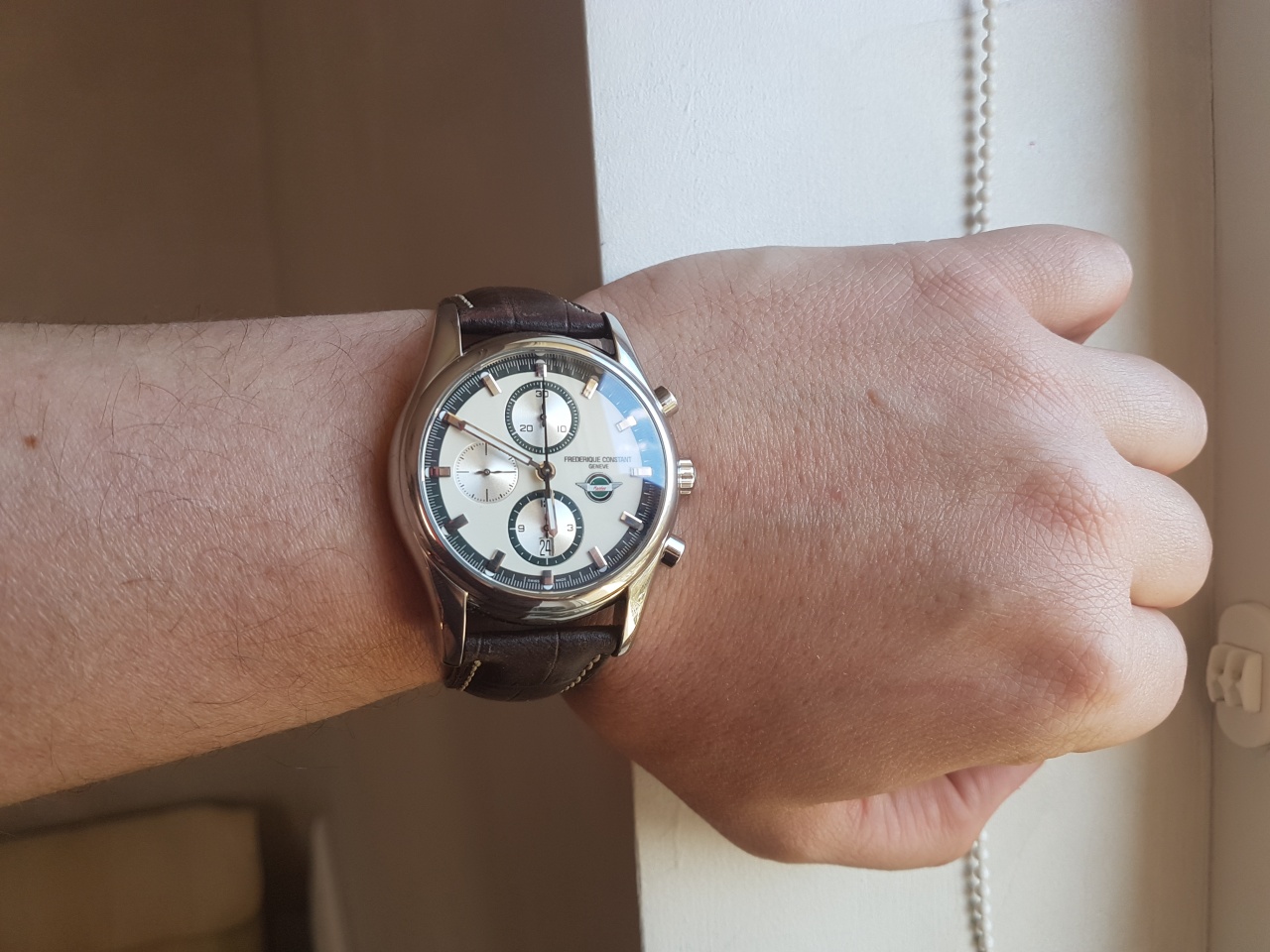 Эти серо зеленые канты вокруг счетчиков хронографа, и по всему периметру, это эмалированный циферблат цвета слоновой кости, и сам корпус просто погружают нас в эту атмосферу машин 60тых. И при этом часы остаются очень современными и актуальными.