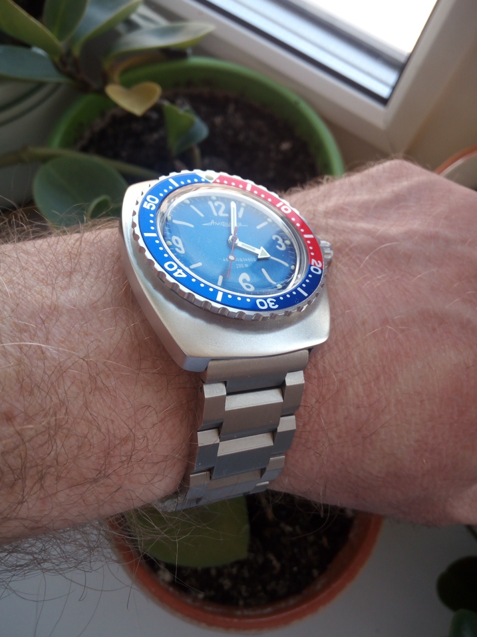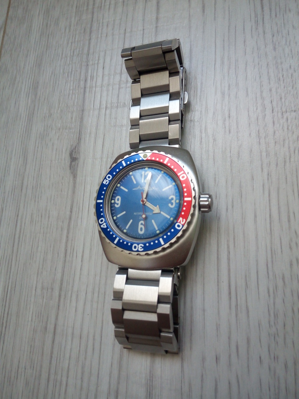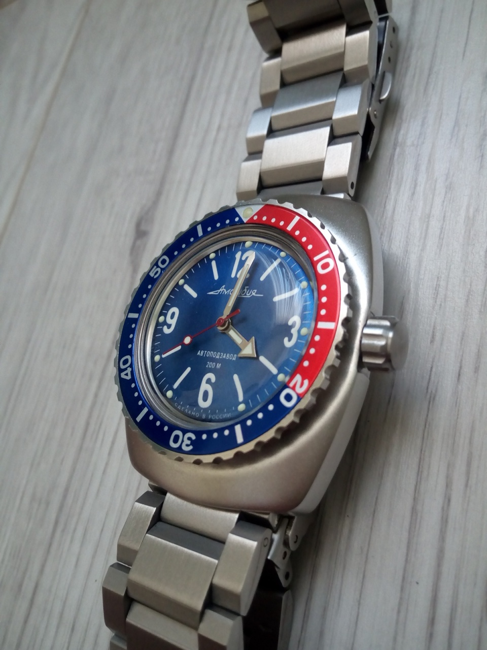 Продаю модернизированную Амфибию 090510. Дорогой кастомный безель с вставкой Сейко. Заменена заводная головка на стальную, задняя крышка с окном и новым кольцом под 45%. Хороший литой браслет на руку примерно 18см, есть 3 дополнительных звена. Часы в отличном состоянии, корпус без царапин, стекло чистое. В комплекте родная коробка и паспорт.