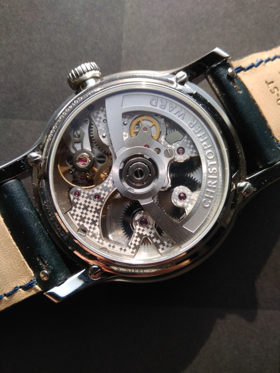В этих часах стоит неплохо себя зарекомендовавший собственный мануфактурный автоматический калибр SH21 с датой: 31 камень, 28.800 в час (4 Hz), 120 часов запас хода. Разумеется это COSC-сертифицированный хронометр. Ротор-скелетон из вольфрама с крупной и хорошо сделанной надписью "Christopher Ward". Механизм довольно сильно скелетизирован и это его отличает от первых версий, а также украшен собственным паттерном "twinflag", что как бы намекает, что часы конечно Swiss made, но марка британская. Винты по традиции полированные, синения как не было так и не будет по принципиальным соображением. Мне понравился вживую этот twinflag pattern. С одной стороны я слабо представляю какие-либо женевские волны с подобной скелетизацией калибра и ротора, с другой стороны всё равно в часах до 5к евро вся эта "красота по-свиссовски" типичная машинная и потому априори неинтересная работа (за исключением единичных немцев типа ДДС, Корнела, Турби и т.д., которые украшают простые мехи и собственно в том и смысл). Тут что-то нетипичное, а главное выглядит вполне симпатично.