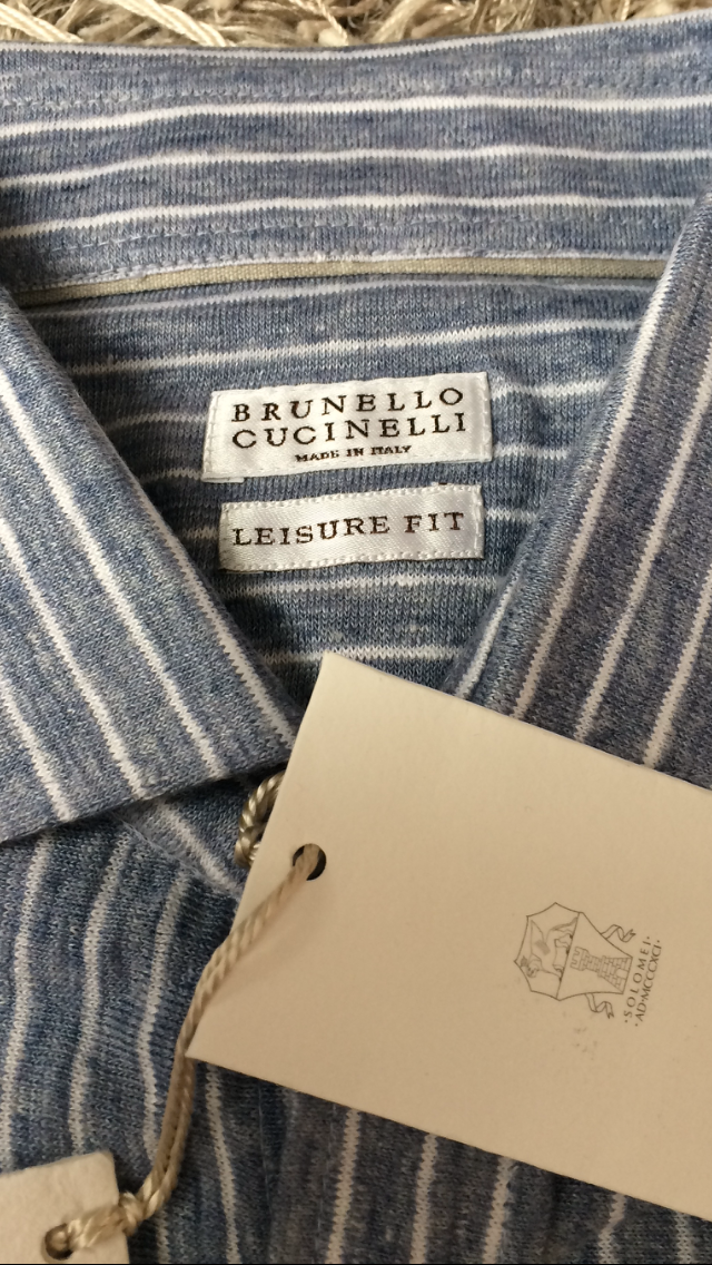 В продаже,новая мужская рубашка свободного кроя Leisure из эластичного льна в полоску от известной итальянской марки BRUNELLO CUCINELLI .Модель с характерной узловатостью натуральных волокон,которая придаёт поверхности слегка неравномерный вид,подчёркивающий неформальный стиль.Лёгкая рубашка из льняного джерси характеризуется короткими рукавами и отложным воротом на пуговицах.