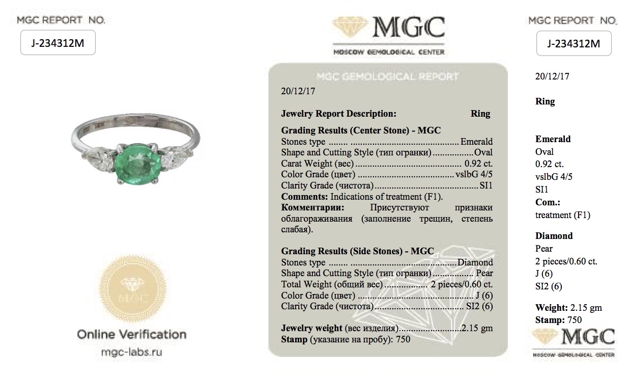 Кольцо из белого золота с изумрудом 0,92 карат и бриллиантами 0,60 карат(сертификат МГЦ)