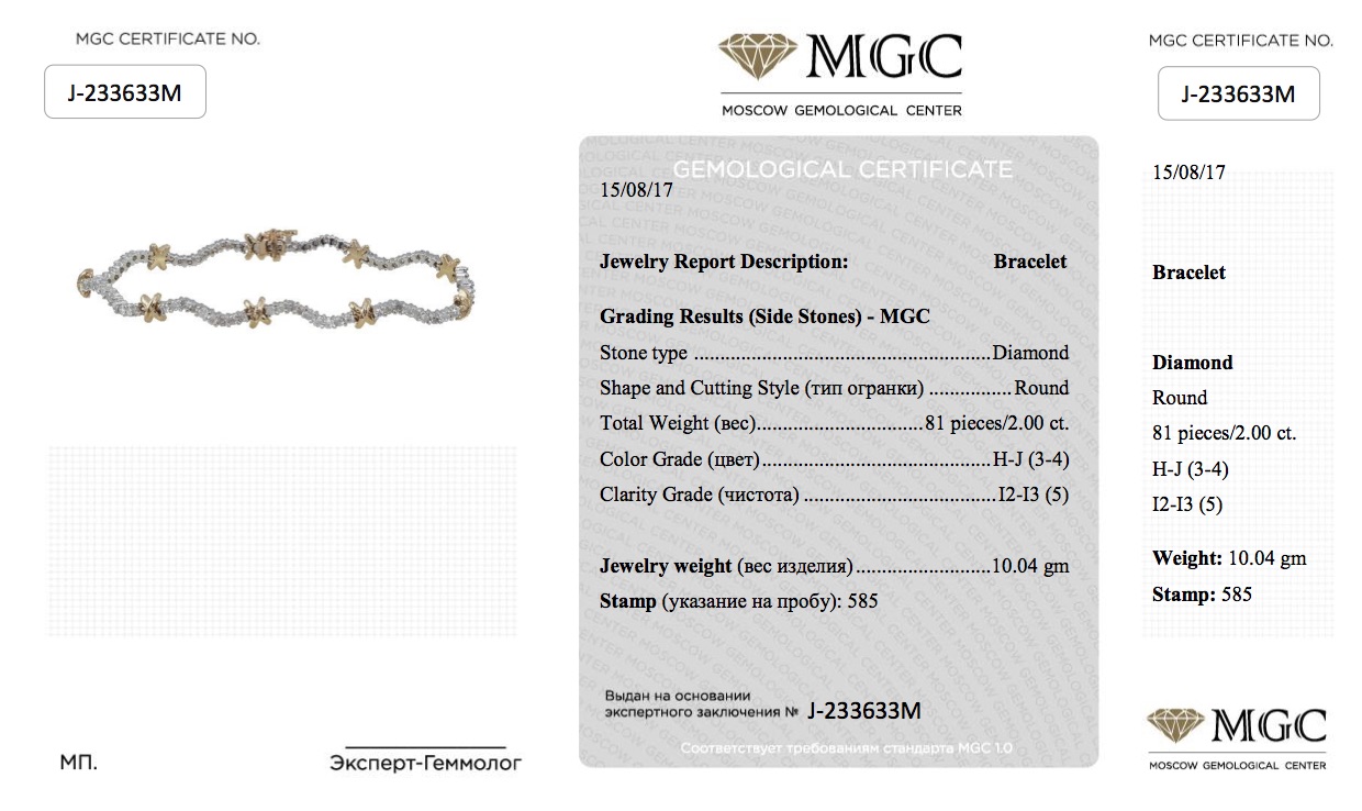 Браслет из белого и желтого золота с бриллиантами 2 карата (сертификат МГЦ)