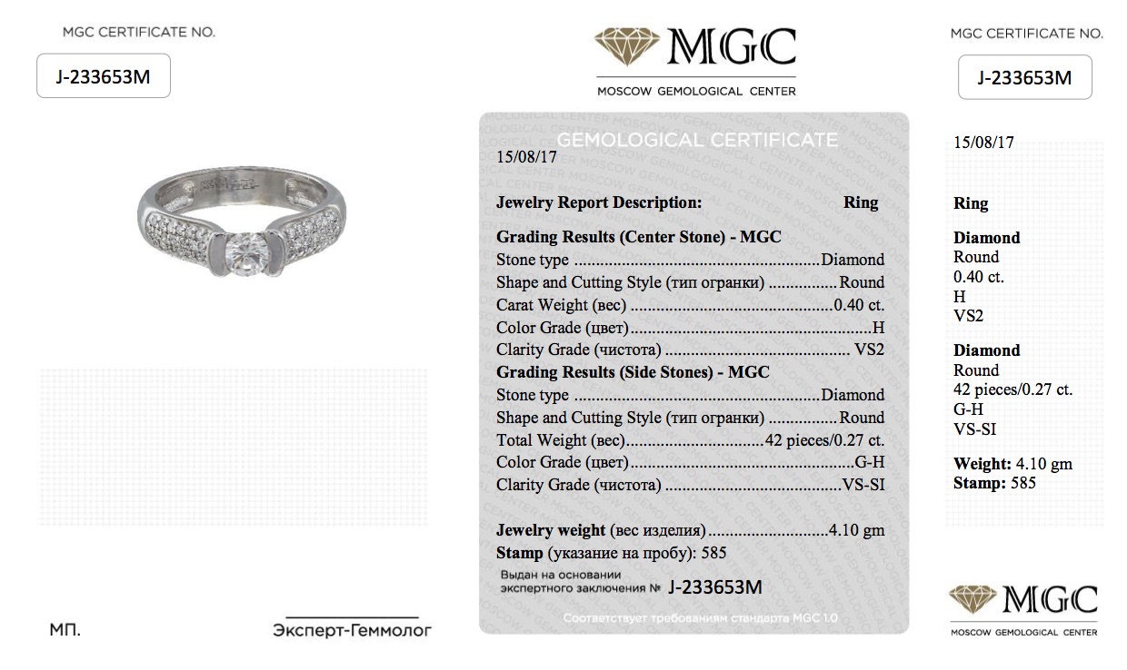 Кольцо из белого золота с бриллиантами 0,67 карат (сертификат МГЦ)