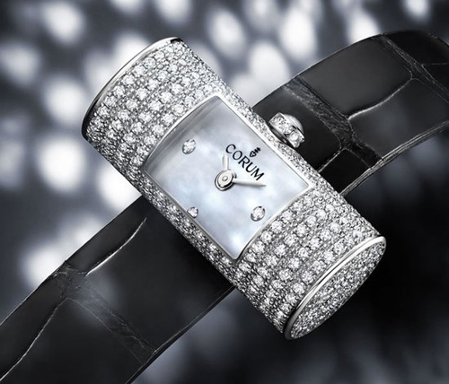 Корпус инкрустирован белыми перламутровыми кабошонами, а над отметкой «12» расположена рифлёная головка подзавода. По желанию покупателя циферблат может быть полностью украшен бриллиантами или трёмя бриллиантами на отметках 3, 6 и 9 часов на белом перламутровом фоне. Часы оснащены кварцевым механизмом CO137.