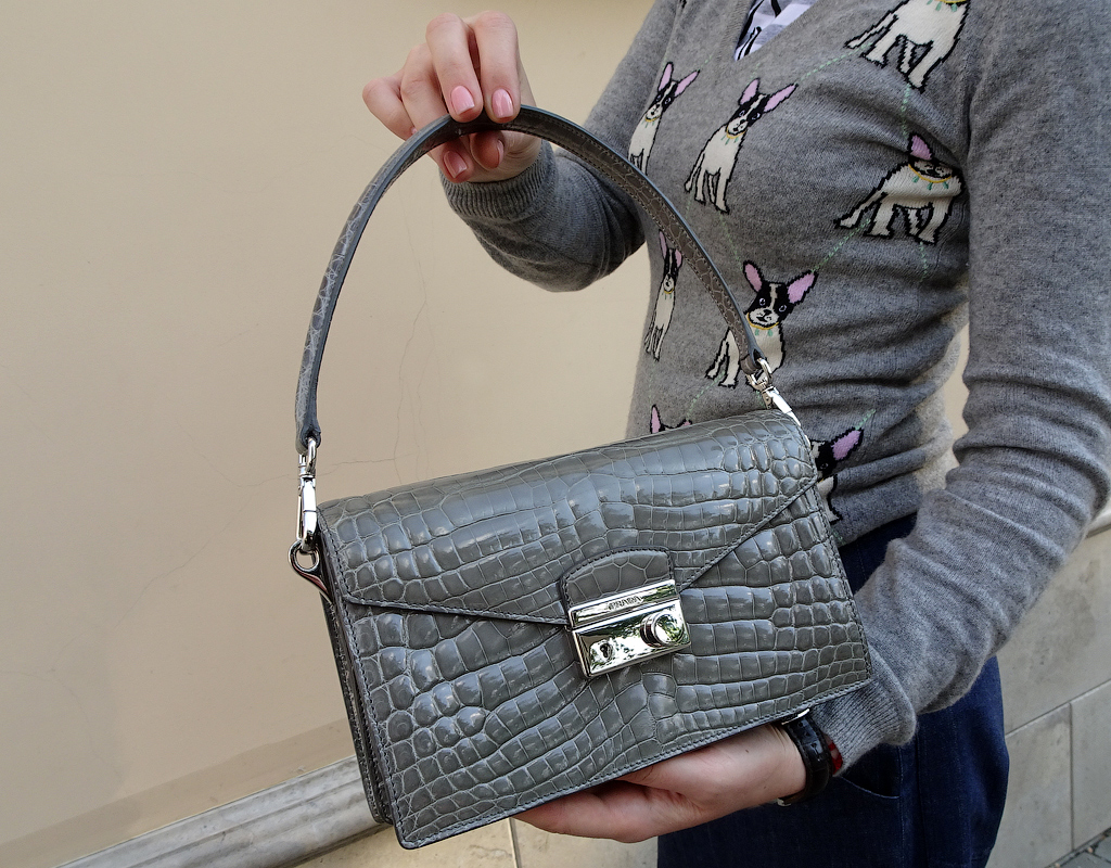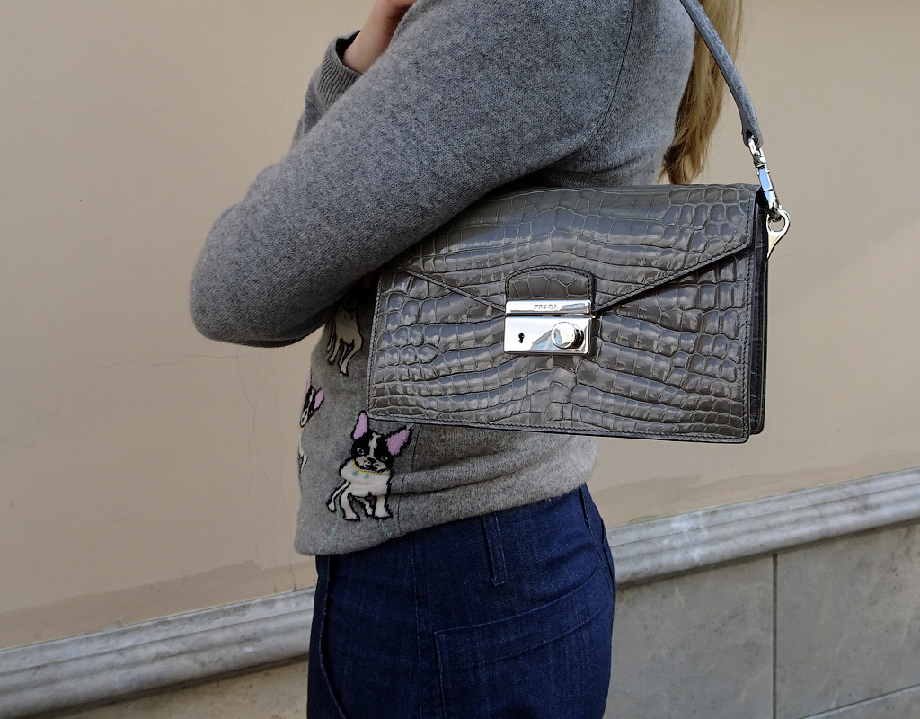 Один из фирменных цветов Prada - великолепный непростой цвет, цвет серо-зеленых глаз. Называется "Marmo" - серый с легким оливковым тоном, меняющимся в зависимости от освещения. Аристократичный спокойно-элегантный, всегда уместный к любой ситуации и подходит к любому стилю.