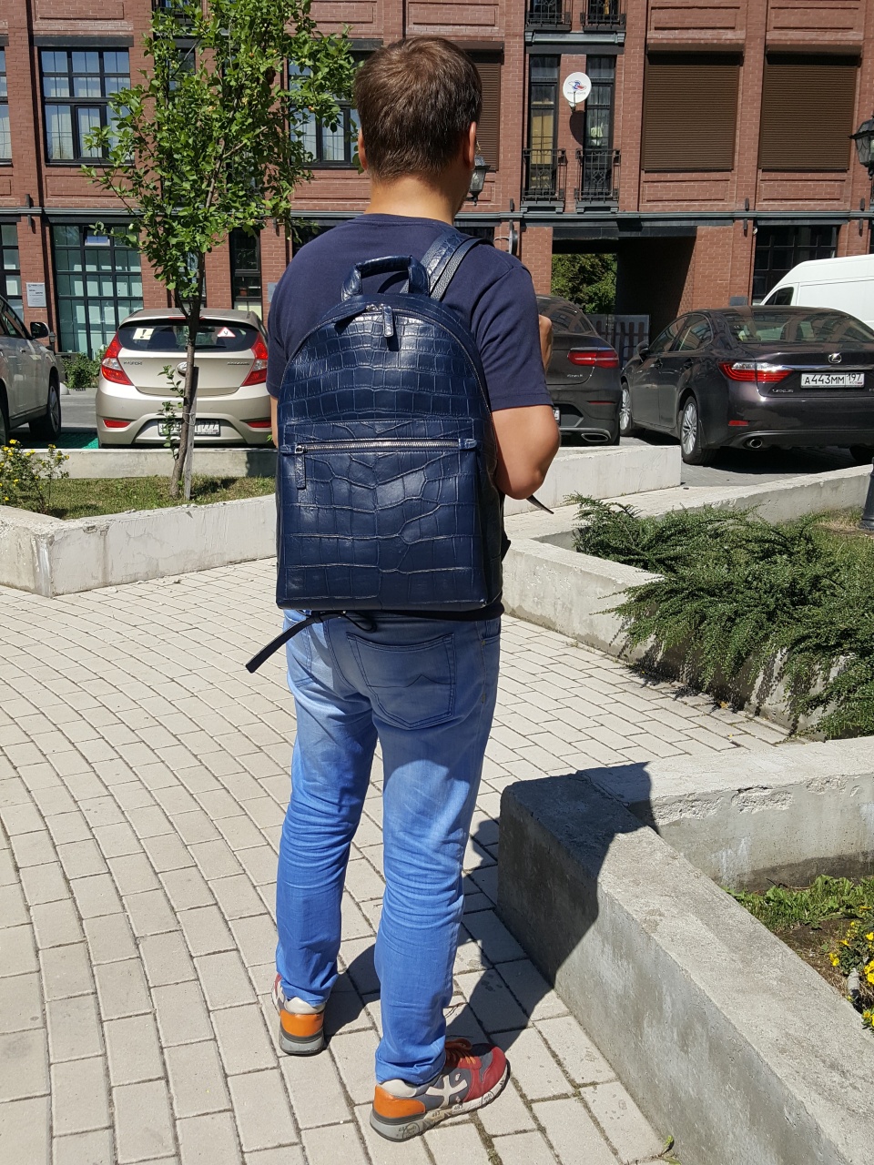 Сзади рюкзак снабжен двумя регулируемыми плечевыми лямками из комбинированной кожи крокодила и оленьей кожи тёмно-синего цвета.
