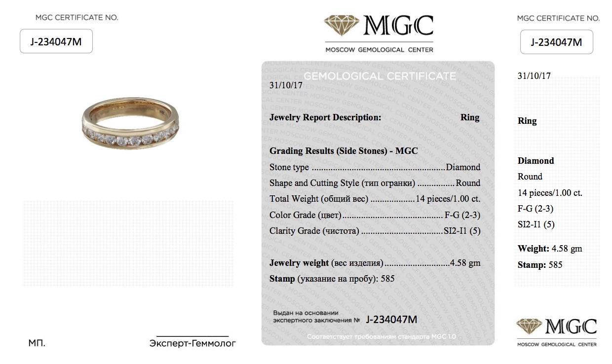 Обручальное кольцо из желтого золота с бриллиантами 1 карат (Сертификат МГЦ)