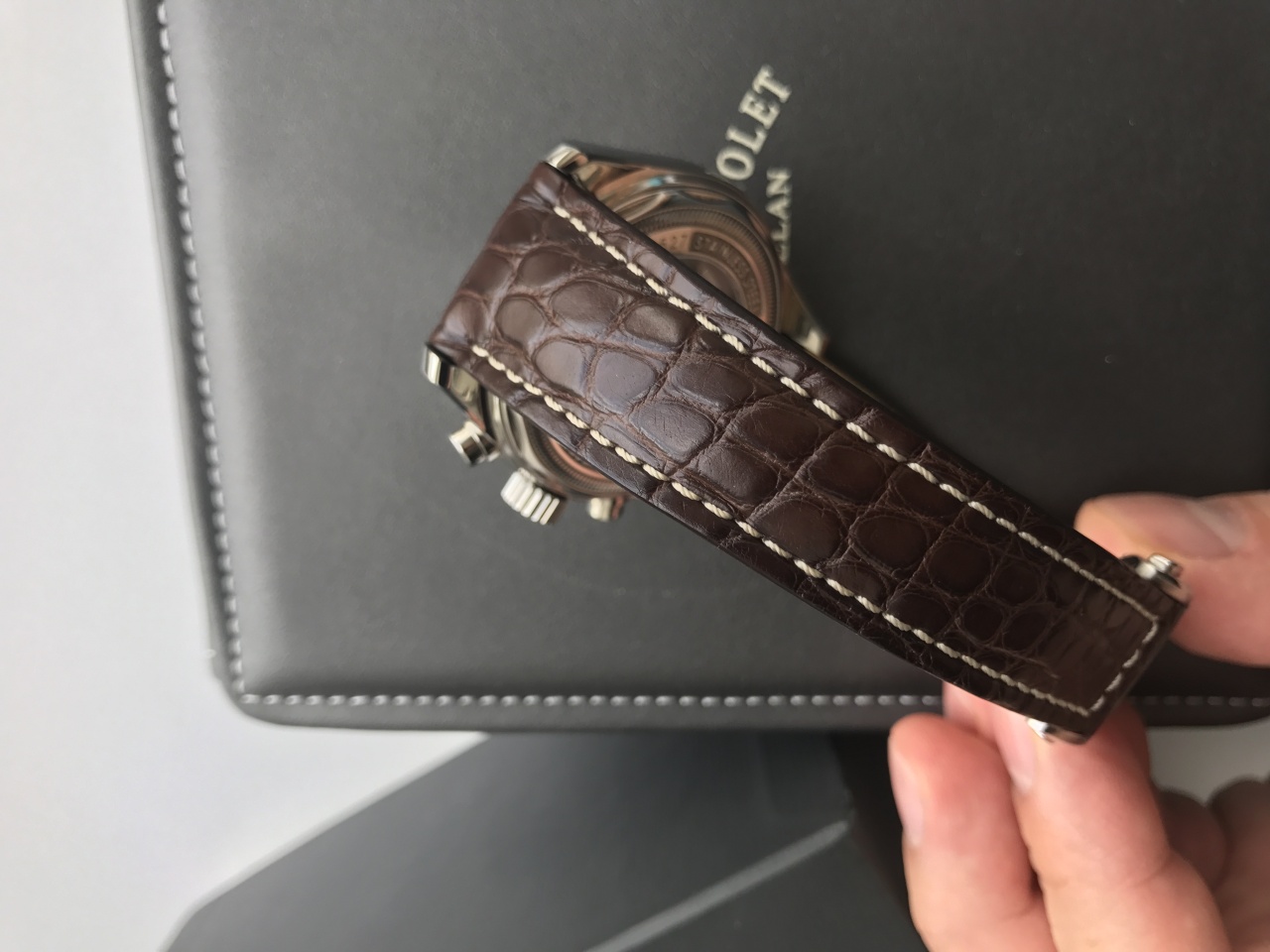 Один из самых красивых хронографов на рынке: позолоченные метки и стрелки, гильоше, шикарный ремень из кожи аллигатора.