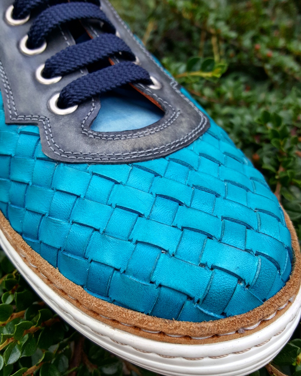 Изготовлены из 100% плетенной (итал. Intrecciato) телячьей кожи высочайшего качества выделки, окрашенной полностью вручную в насыщенный бирюзовый цвет с эффектом патинирования "антик" со вставками из гладкой телячьей кожи серого, джинсового синего и тёмно-синего цвета.