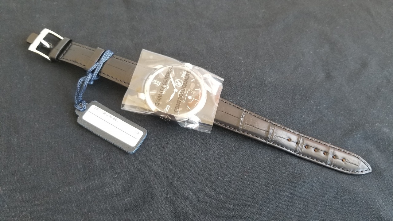 Часы укомплектованы черным ремешком из кожи аллигатора с застежкой из полированной стали.