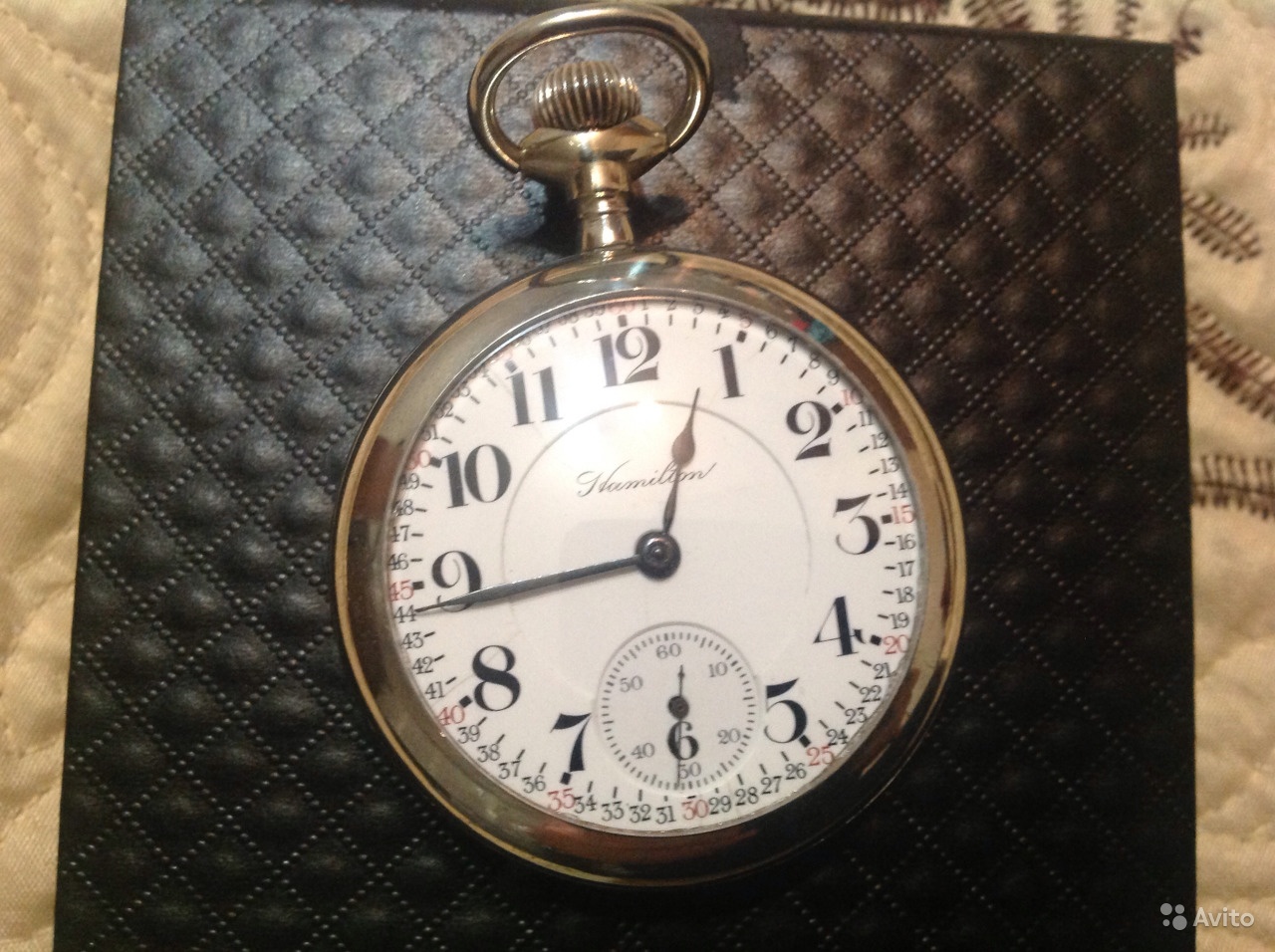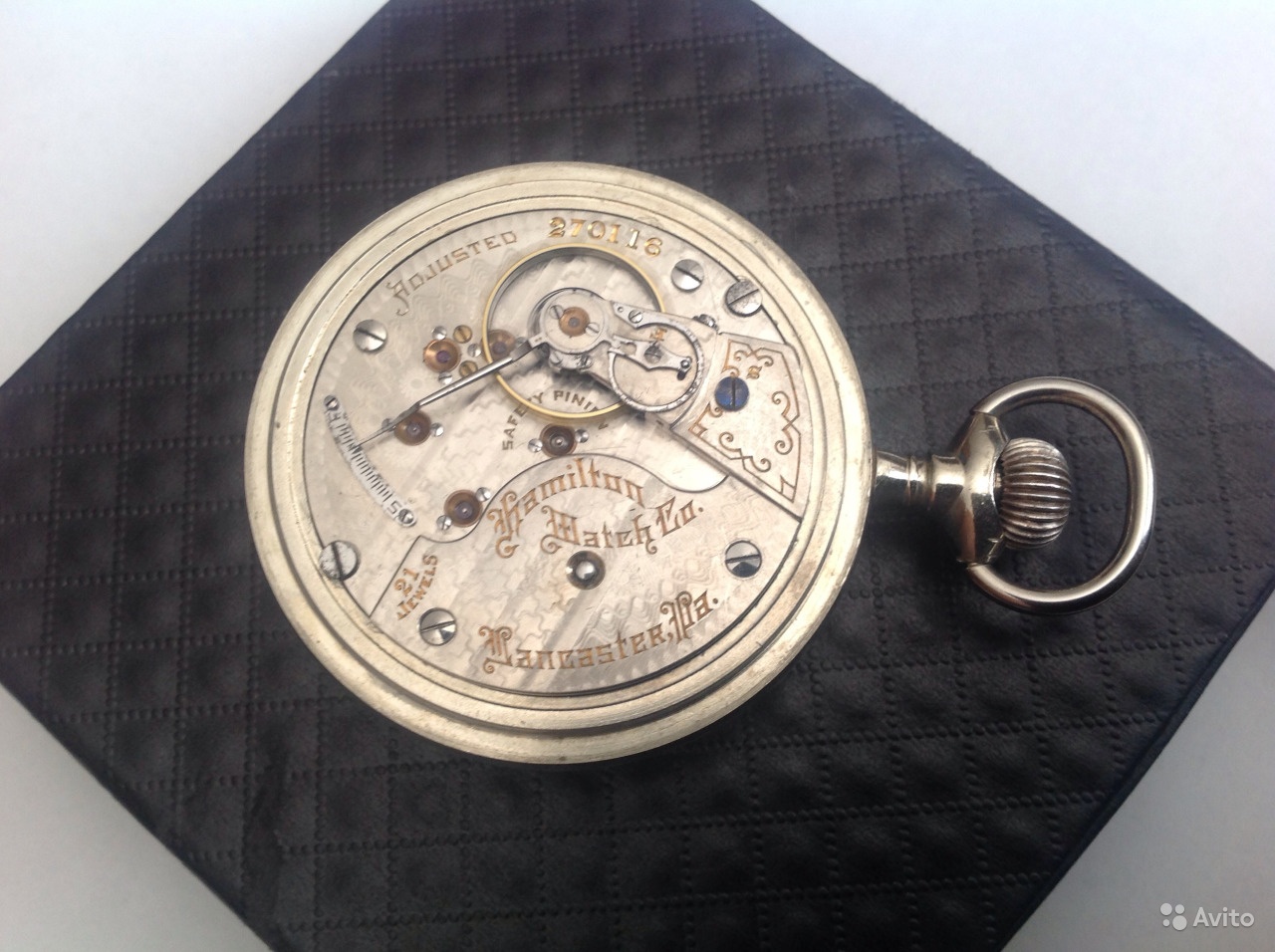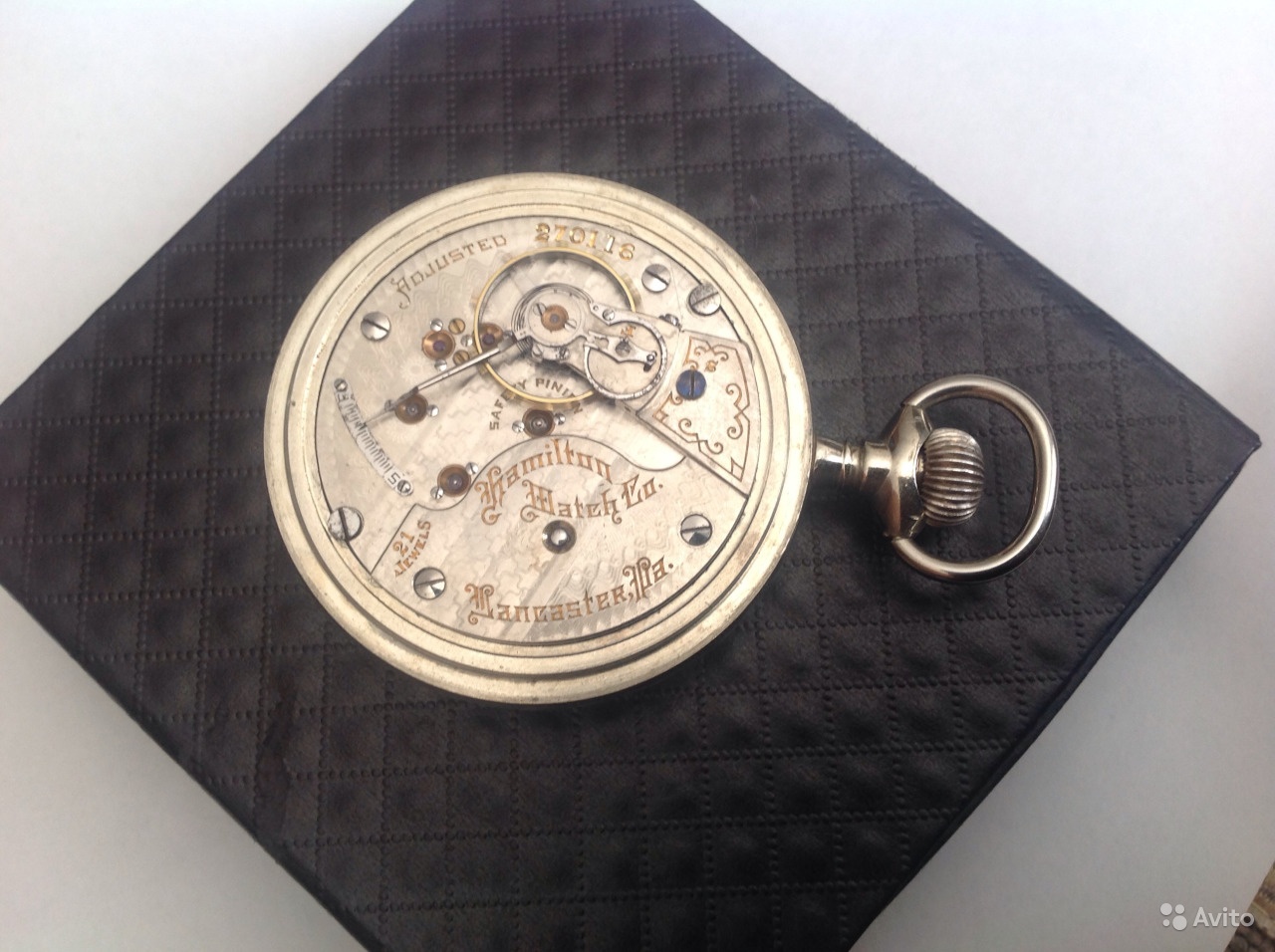 Продам карманные, антикварные часы Hamilton, размер 18s, диаметр без учета ЗГ и короны 54 мм, толщина 18 мм. Модель выпускалась с 1900 по 1909 годы на мануфактуре (заводе) в Lancaster, Pennsylvania, USA - было выпущено 210596 штук такой модели часов. Ручной завод, класс механизма 940, модель 1 (очень высокий, количество камней в механизме 21, которые закреплены в шатонах (пуансонах). Плата, мосты, шестерни заводного механизма имеют красивый рисунок (обратите внимание какое внимание уделено надписям на механизме).