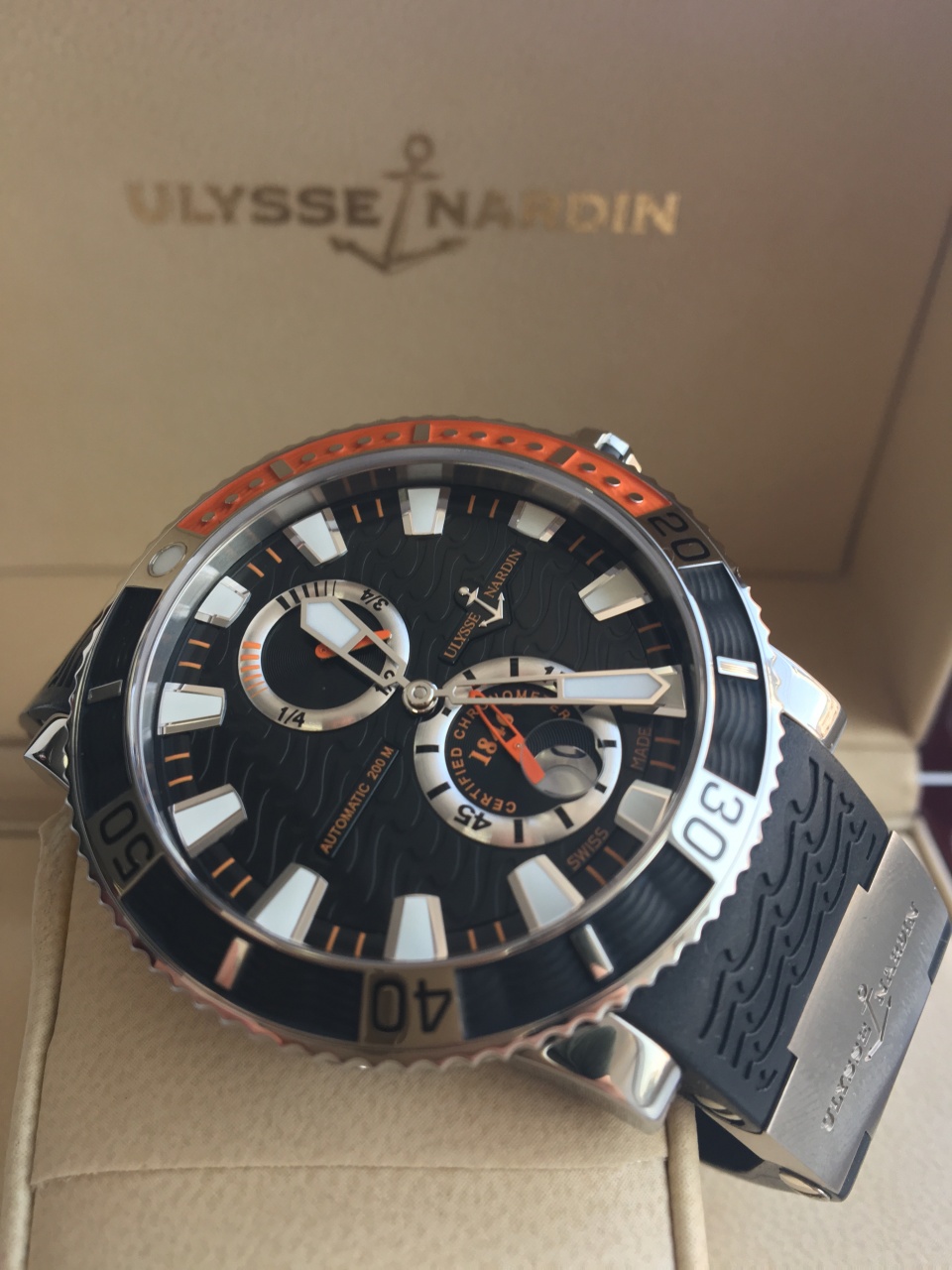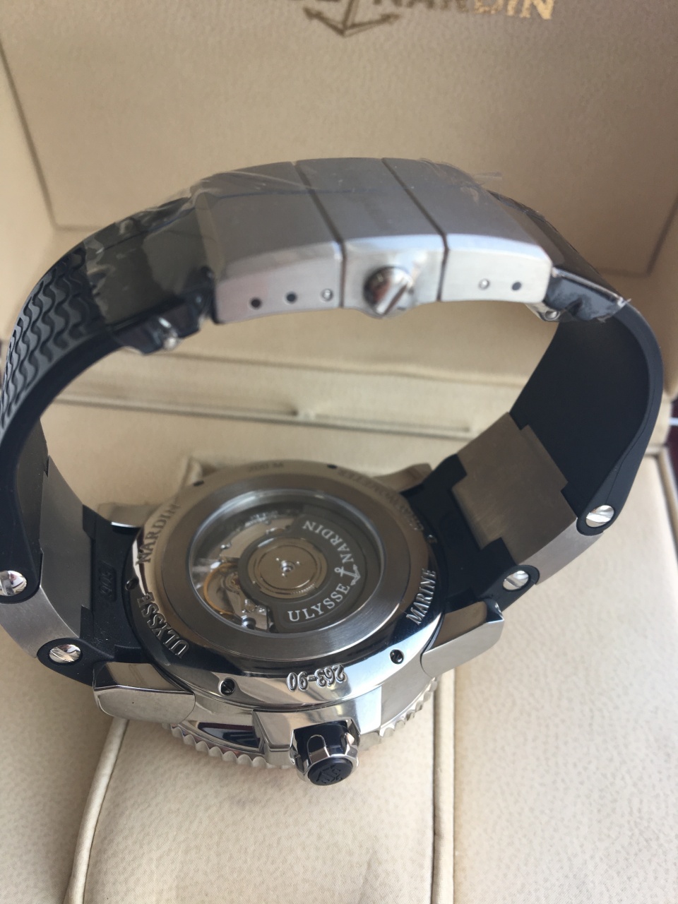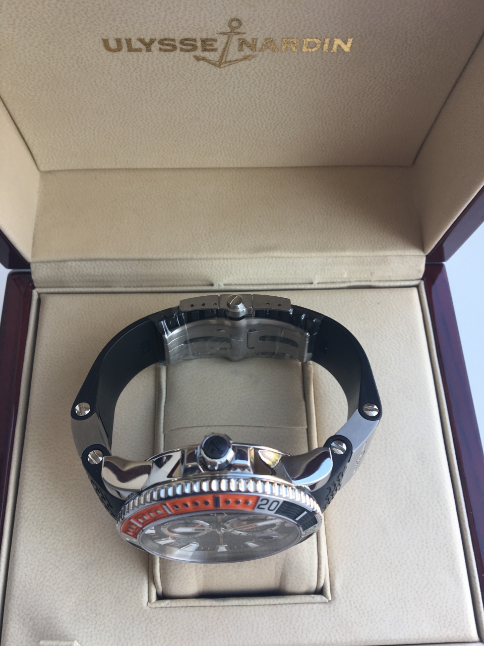 Механизм - автоматический, Калибр UN-26. Корпус - сталь, Новинка 2014 года пополнила коллекцию Marine Diver с непревзойденной точностью на протяжении веков, Ulysse Nardin в морских далях вместе с моряками. В очередной раз знаменитый часовщик произвел на свет новую модель посвященную морским существам и великолепному океану, что бы дополнить свою желанную Marine коллекцию. Модель выполнена в исполнении 2 материалов корпуса: стали и титана. Заводная головка так же выполнена из стали с каучуковыми вставками для большего удобства при заводе часов. Безель с оранжевой вставкой. Циферблат с классическими черными волнами, метки и стрелки покрыты люминесцентным составом для лучшей видимости под водой и в темное время суток. Часы с автоподзаводом, калибр UN-26 на 28 камнях, 28800 полуколебаний в час и запасом хода в 42 часа. Окошко даты в положении на 6 часов с маленькой секундной стрелкой. Индикатор запаса хода в положении на 12 часов. Ремешок выполнен из черного каучука с титановыми вставками, одна из них с фирменной надписью Ulysse Nardin и раскладной застежкой из титана и стали.