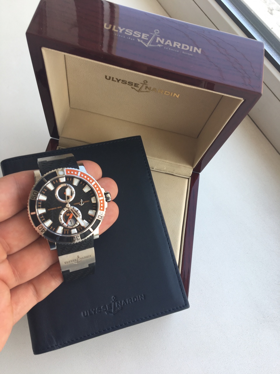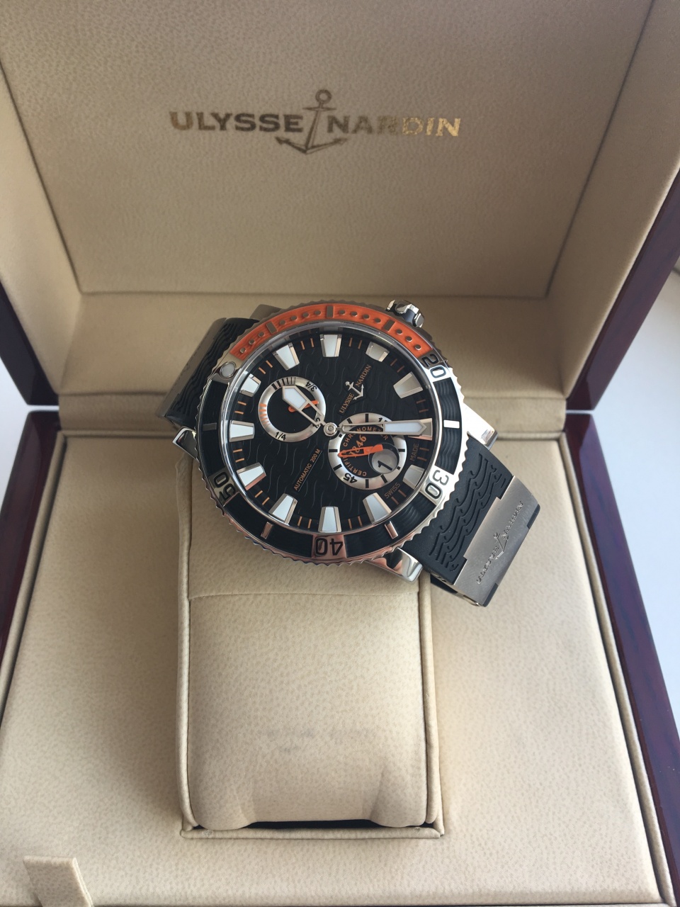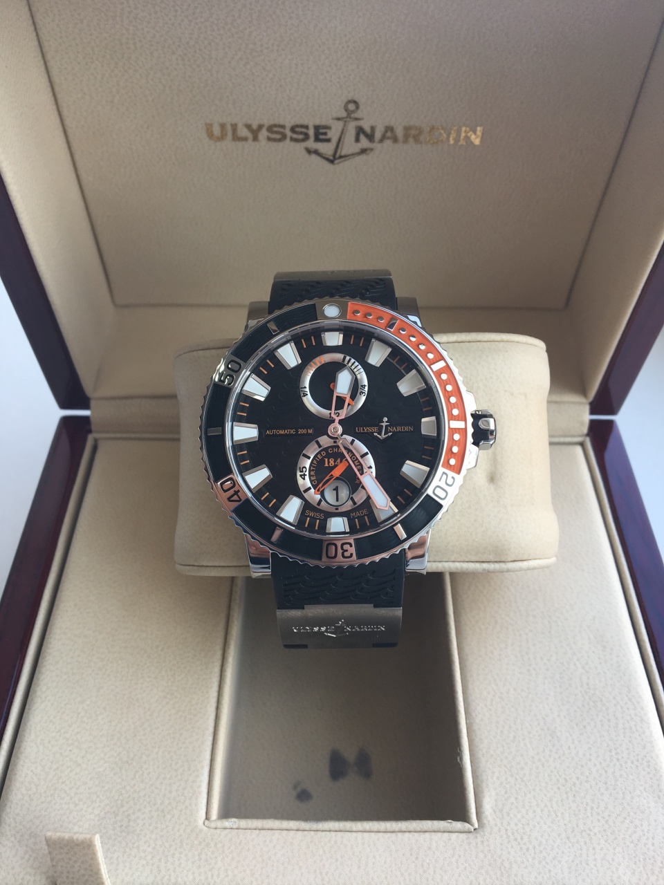 Механизм - автоматический, Калибр UN-26. Корпус - сталь, Новинка 2014 года пополнила коллекцию Marine Diver с непревзойденной точностью на протяжении веков, Ulysse Nardin в морских далях вместе с моряками. В очередной раз знаменитый часовщик произвел на свет новую модель посвященную морским существам и великолепному океану, что бы дополнить свою желанную Marine коллекцию. Модель выполнена в исполнении 2 материалов корпуса: стали и титана. Заводная головка так же выполнена из стали с каучуковыми вставками для большего удобства при заводе часов. Безель с оранжевой вставкой. Циферблат с классическими черными волнами, метки и стрелки покрыты люминесцентным составом для лучшей видимости под водой и в темное время суток. Часы с автоподзаводом, калибр UN-26 на 28 камнях, 28800 полуколебаний в час и запасом хода в 42 часа. Окошко даты в положении на 6 часов с маленькой секундной стрелкой. Индикатор запаса хода в положении на 12 часов. Ремешок выполнен из черного каучука с титановыми вставками, одна из них с фирменной надписью Ulysse Nardin и раскладной застежкой из титана и стали.