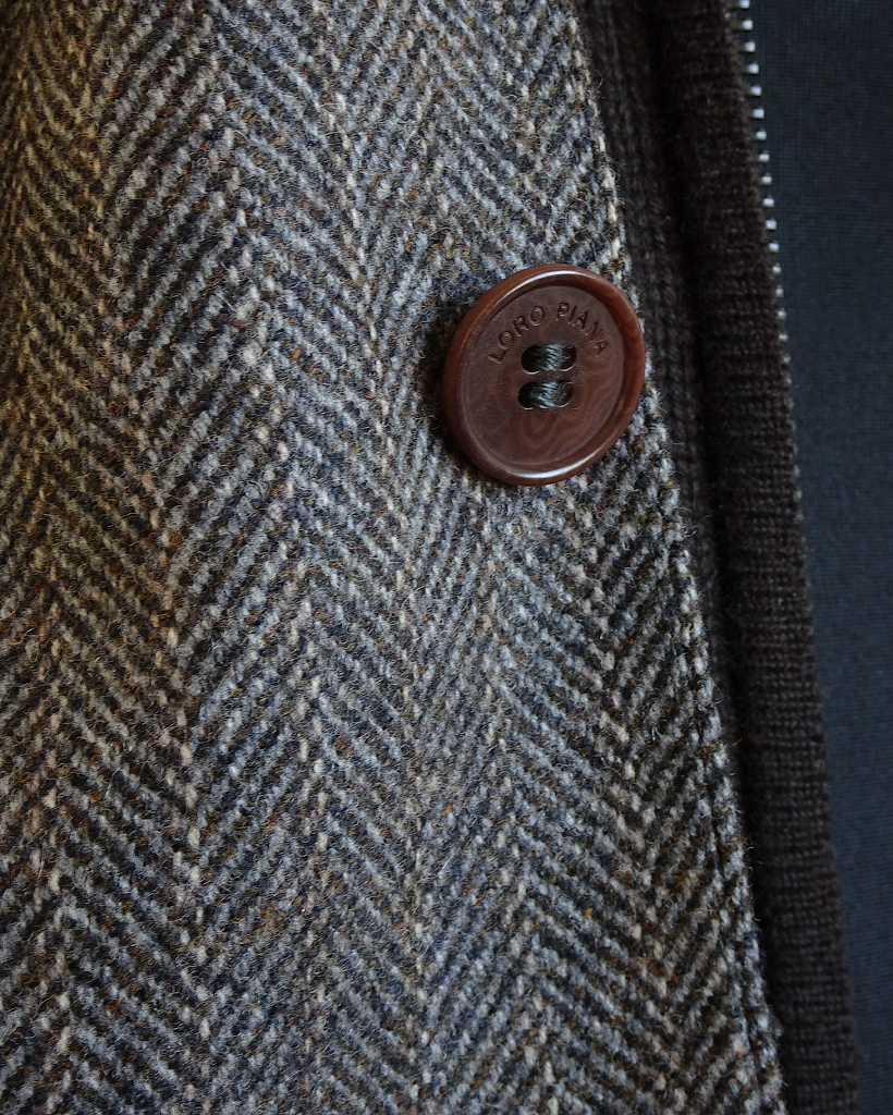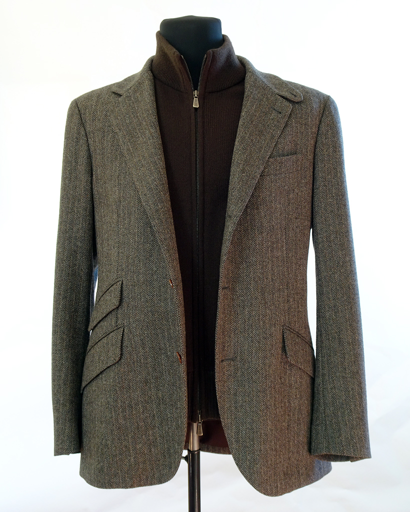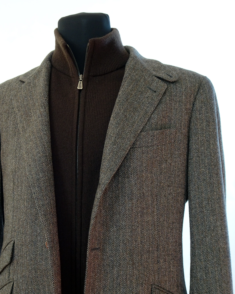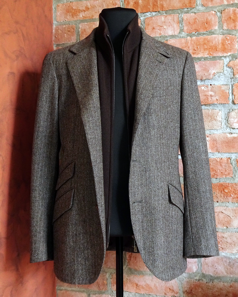 Цвет блейзера: серо-коричневый с рисунком в елочку Herringbone.