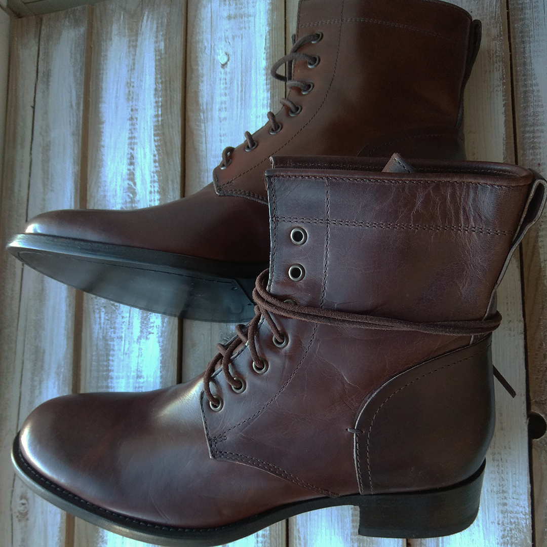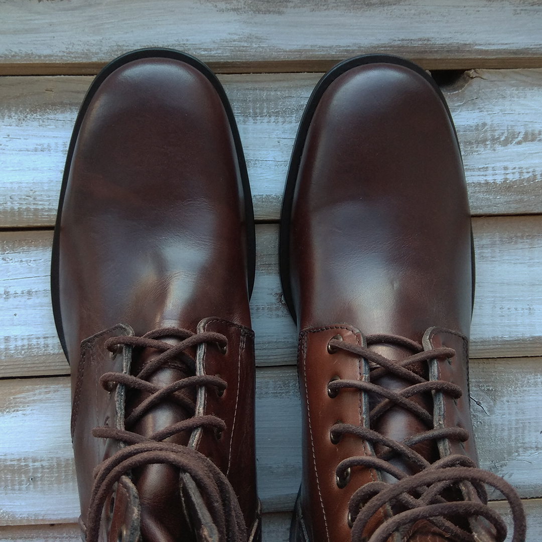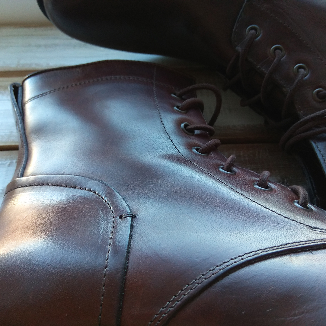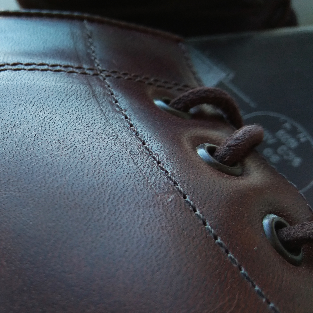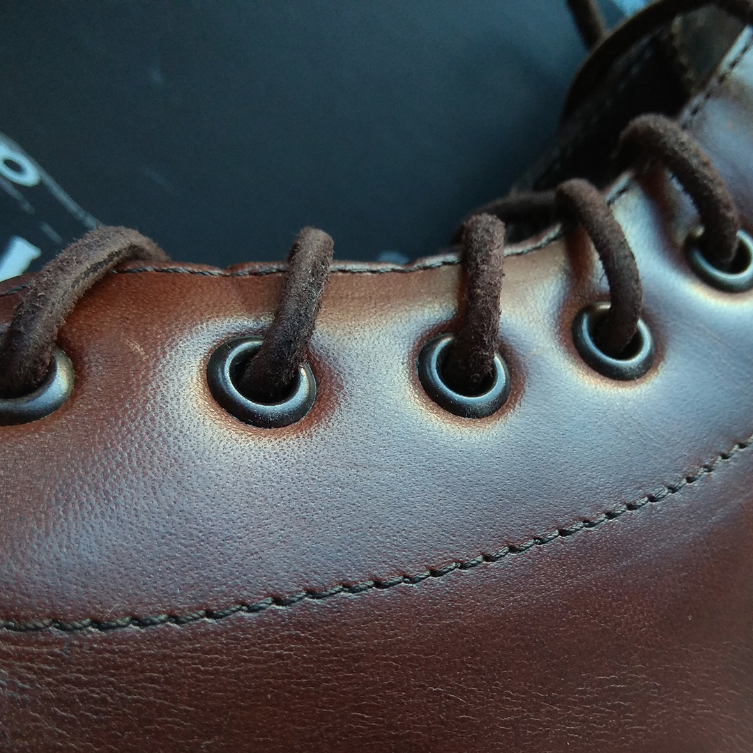 Телячья кожа верха растительного дубления без коррекции лица (full grain), очень жирная — относительно водостойка. Полностью кожаная подкладка, наборный каблук, латунные люверсы, кожаные шнурки круглого сечения, язычок с клапаном на половину высоты, метод крепления подошвы: прошивка + гвозди.