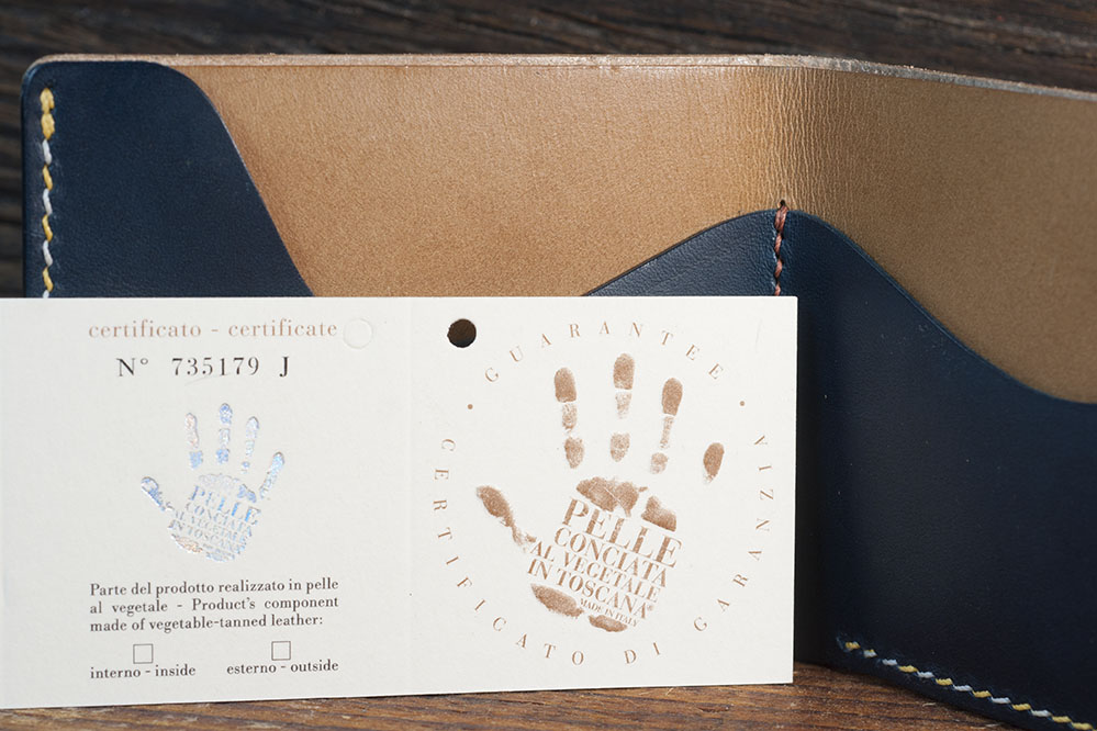 Тосканская телячья кожа выделана вручную исключительно естественными извлеченными из растений танинами, что подтверждается индивидуальным сертификатом на каждое изделие.
