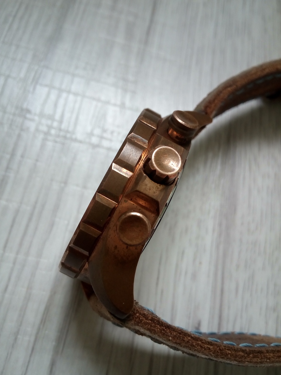 Состояние очень хорошее, стекло чистое, патина натуральная, ремень родной. В комплекте только часы. Все крутится, нажимается как нужно.
