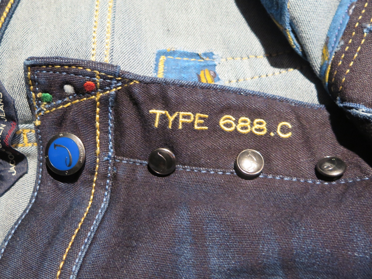 Сзади на правом бедре джинсы имеют фирменный ярлык из кожи синего цвета с логотипом марки Jасоb Соhёn, изображением мотороллера Lambretta жёлтого цвета, и индивидуальным номером, что указывает на принадлежность к "лимитированной" линейке марки и порядковый!!!