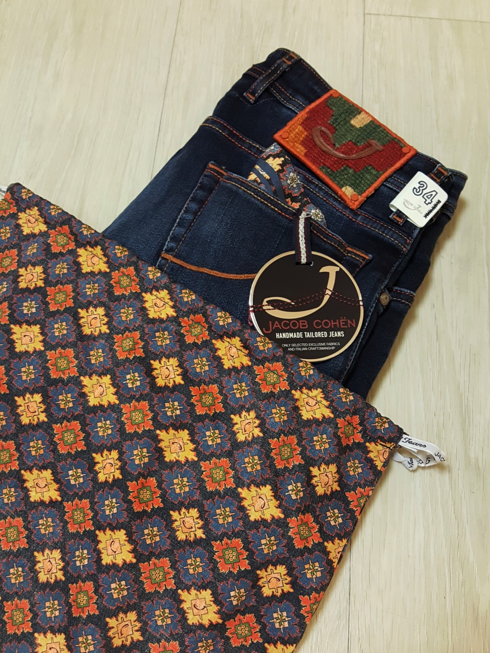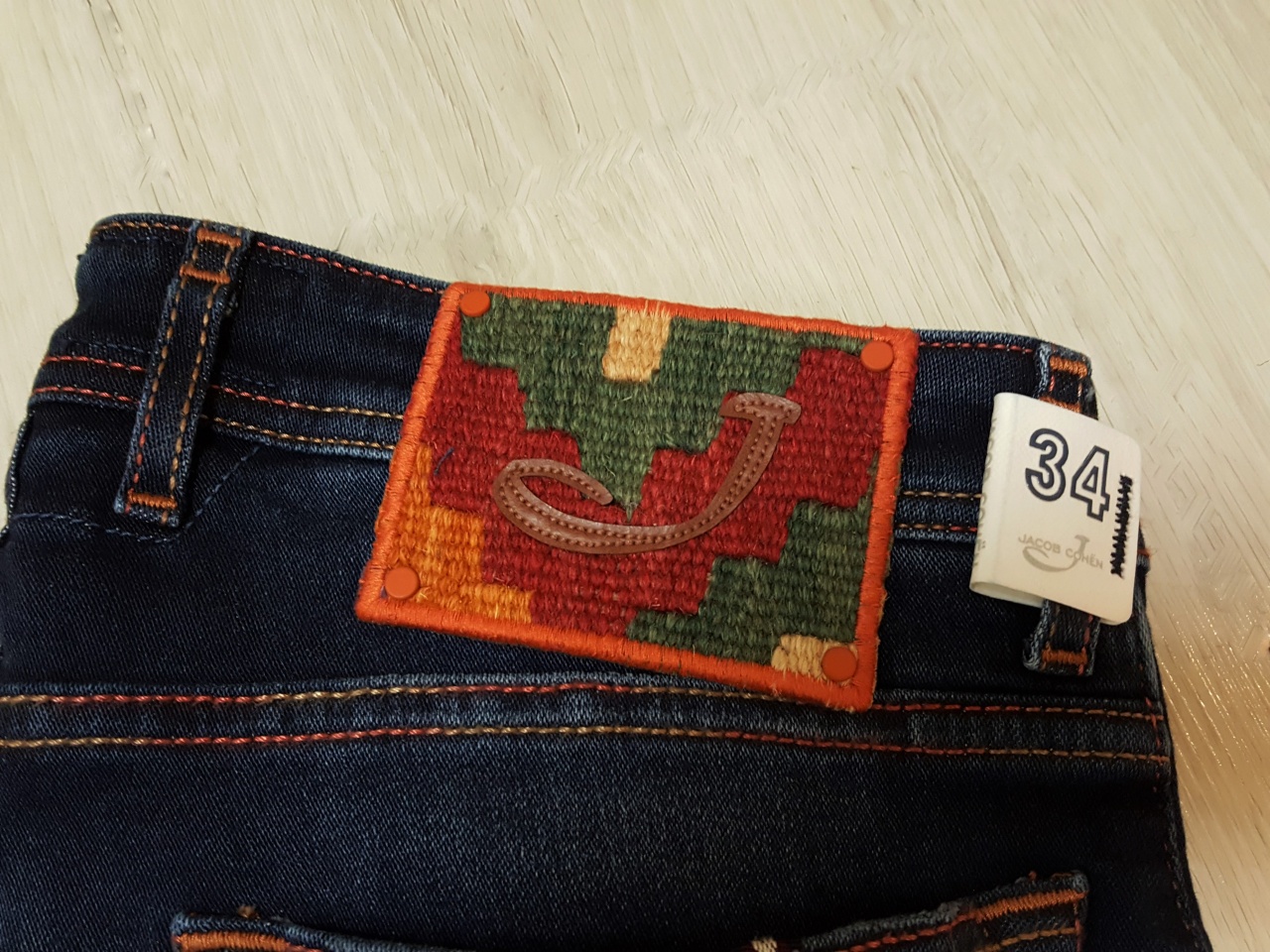 Сзади на правом бедре джинсы имеют ОТСТЁГИВАЮЩИЙСЯ (рекомендуется снимать перед стиркой) фирменный ярлык из ткани "КILIМ" с логотипом марки Jасоb Соhёn, выполненным из кожи, что указывает на принадлежность к "лимитированной" линейке марки!!!