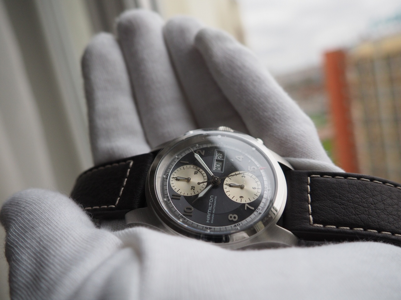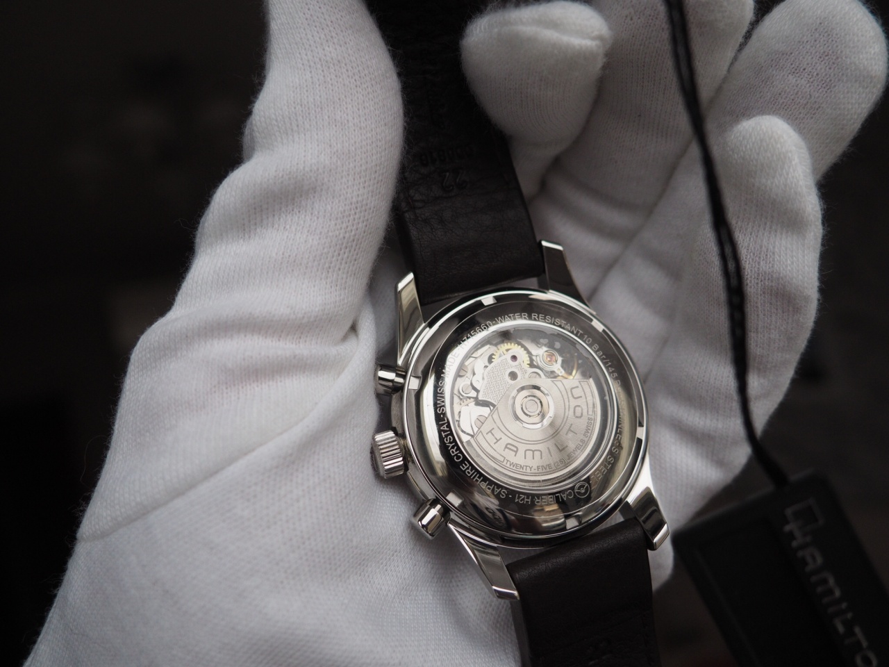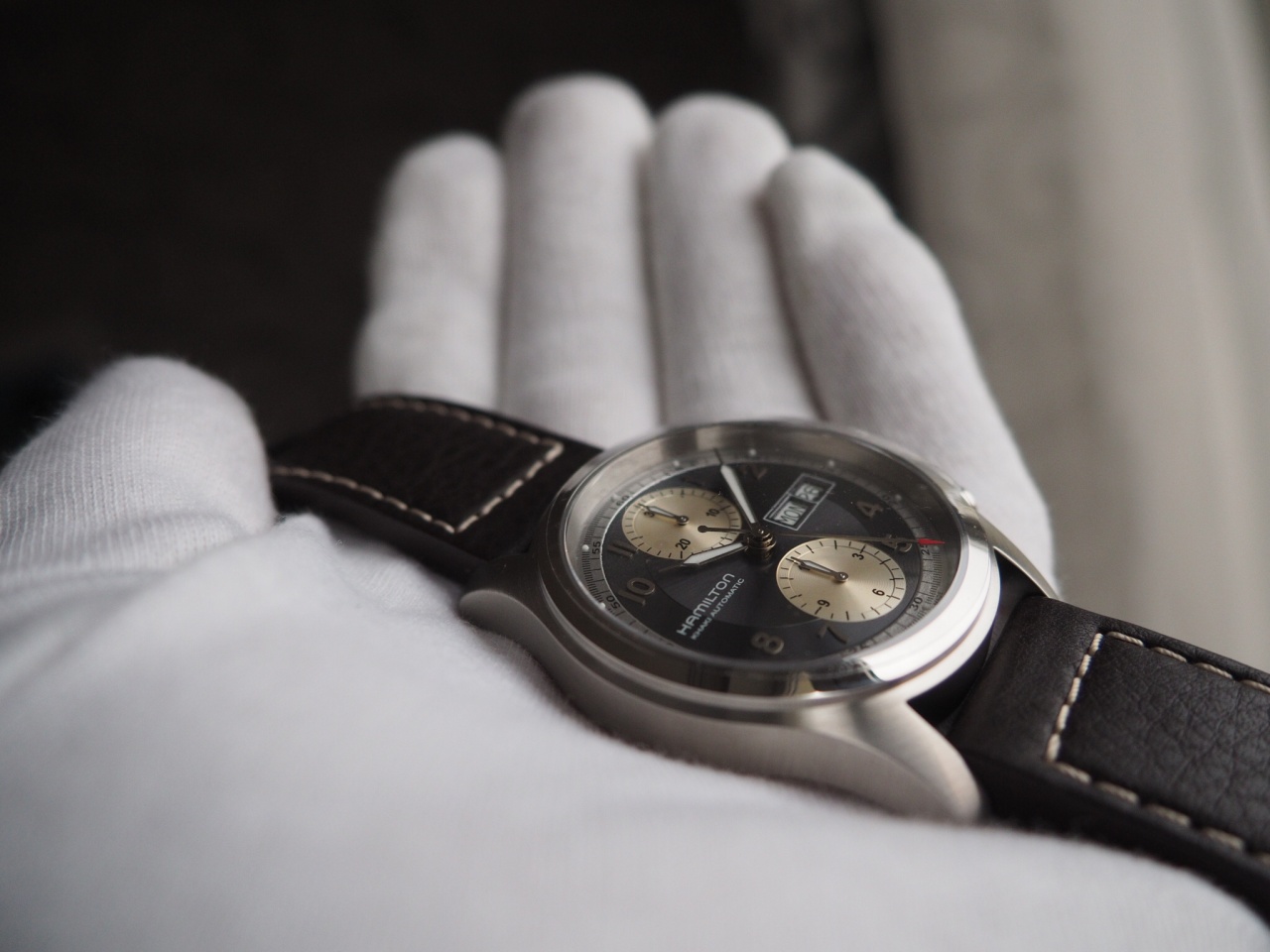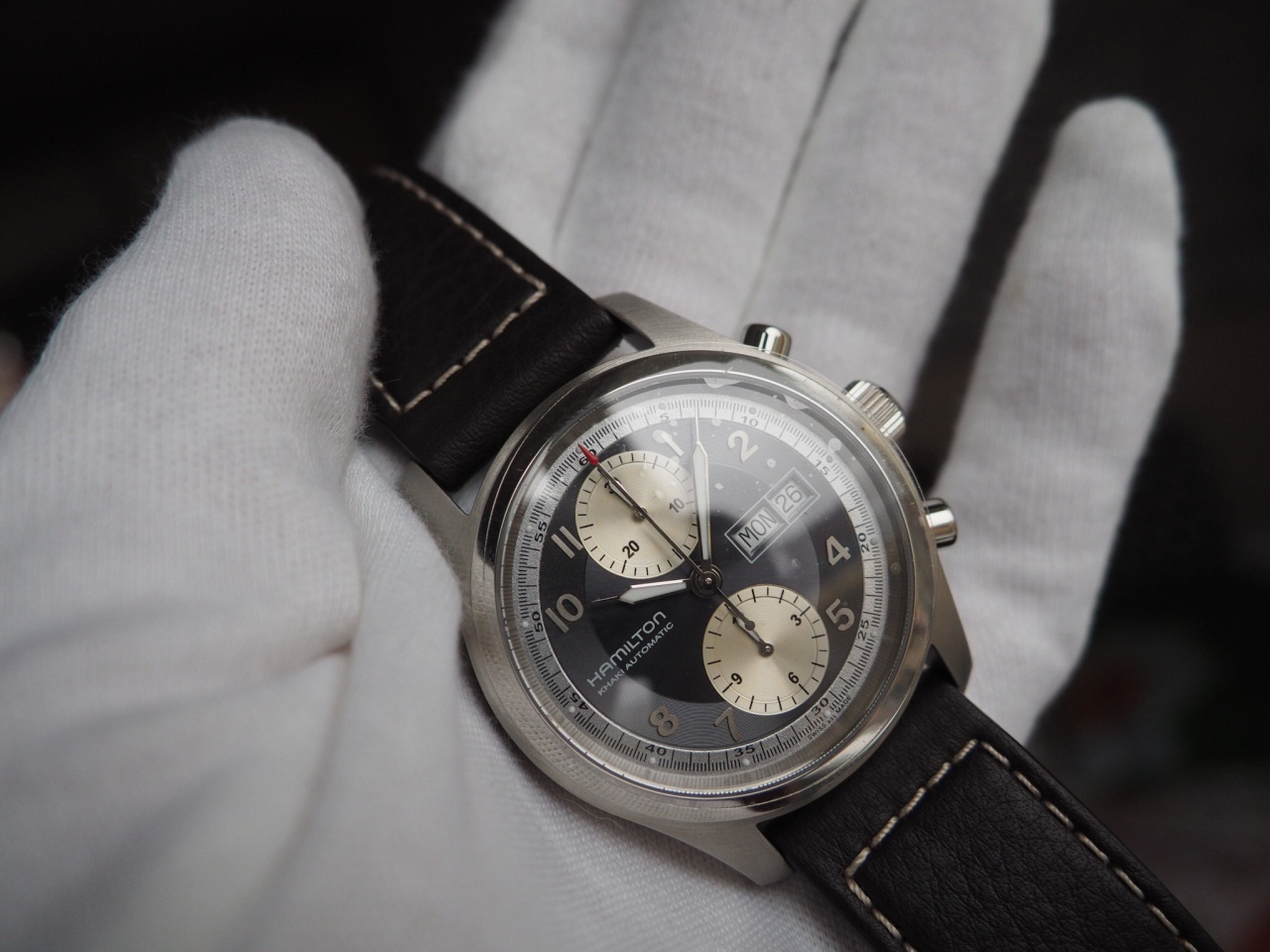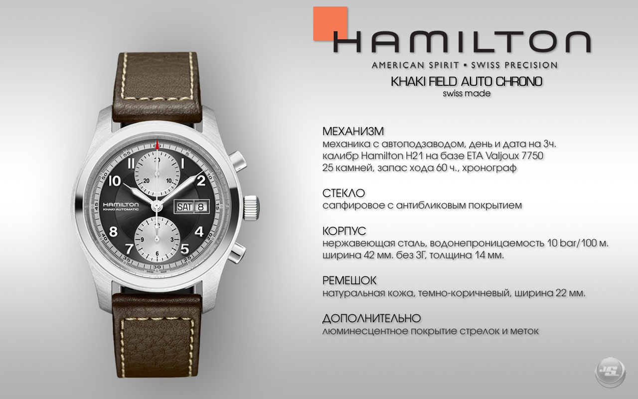 Надежный и точный калибр Hamilton H21 на базе ETA Valjoux 7750 с увеличенным запасом хода до 60 ч., день и дата.