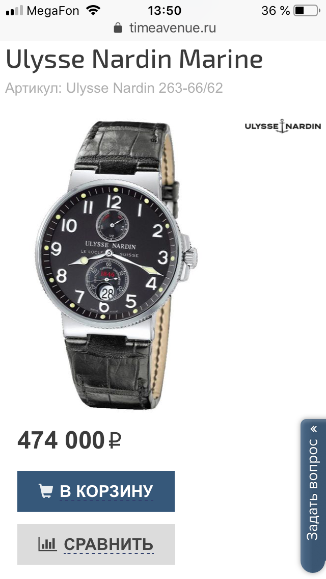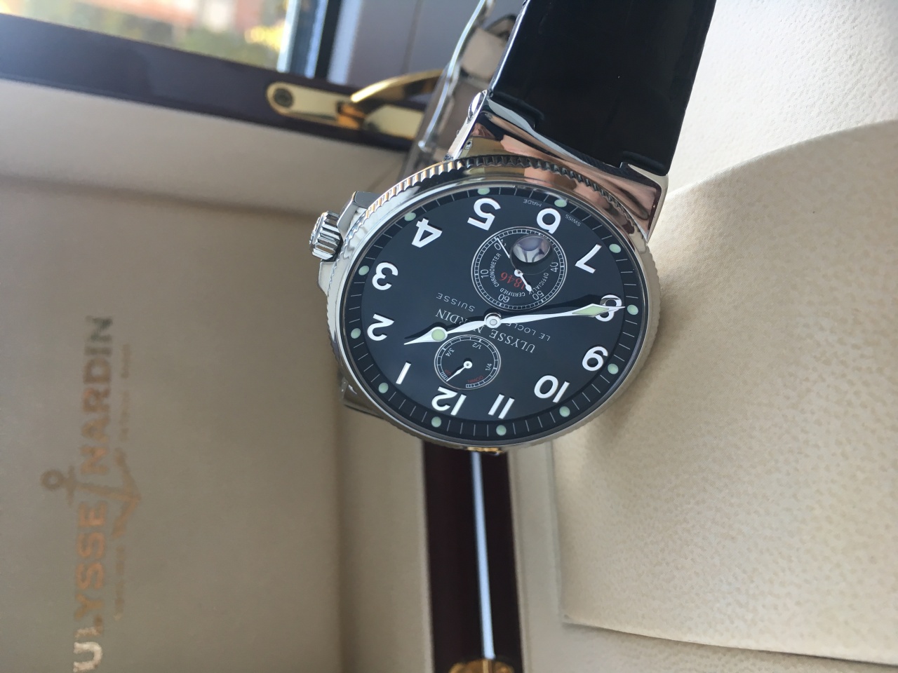 Продам культовый хронометр Ulysse Nardin Maxi Marine 41mm, который дополняет коллекцию морских хронометров, существующую с 1846 года. Официально сертифицированный механизм (C.O.S.C) имеет запас хода 42 часа. Элегантный 41-миллиметровый корпус из высококачественной стали, имеет индивидуальный номер и снабжен фиксируемой на резьбе заводной головкой. Циферблат - черного цвета, на котором расположены: индикатор запаса хода, маленькая секундная стрелка на увеличенном дополнительном циферблате и крупное окошко даты в положении «6» часов. Ремешок из кожи крокодила черного цвета, раскладная застежка. Водонепроницаемость 200 метров.