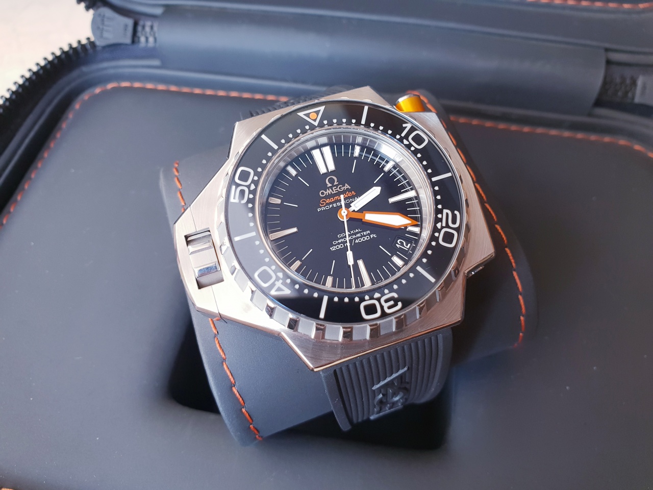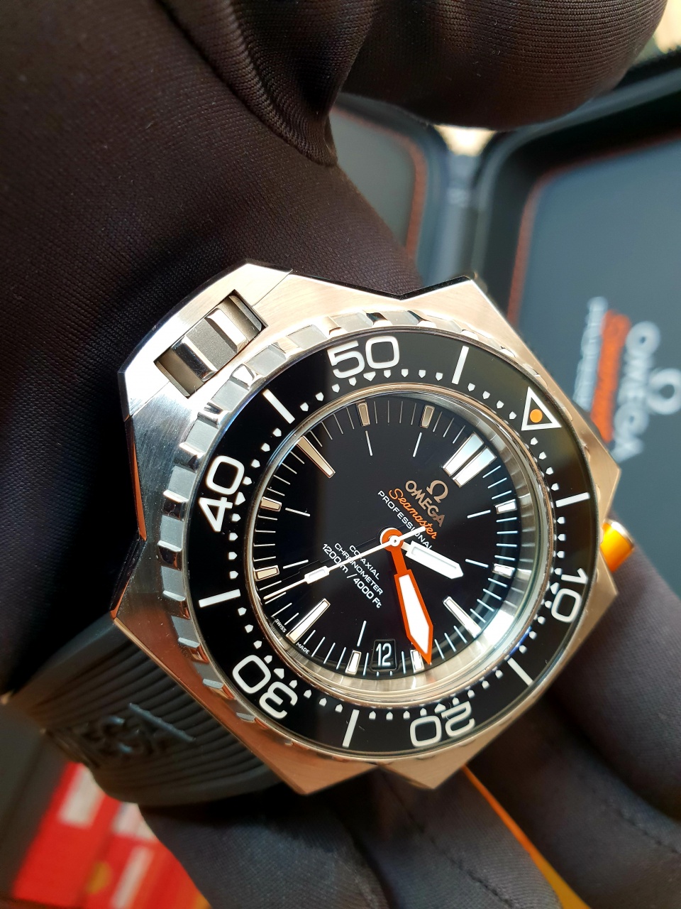 Описание часов: Продажа мужских наручных часов #Omega Seamaster Ploprof 1200M, #часы ref. 224.32.55.21.01.001. В 1970 году OMEGA выпустила часы, которые были способны выдерживать сильнейшее давление, испытываемое дайверами, работающими на большой глубине. Это были Seamaster 600, так называемые «Ploprof» (первые буквы plongeurs professionnels – французских слов, означающих «профессиональные ныряльщики»), и они стали одними из самых прочных, надежных и пригодных для плавания в море наручных часов, которые когда-либо производились. Сейчас OMEGA вводит усовершенствованный вариант классических и мгновенно узнаваемых наручных часов. Новые часы Ploprof 1200M оснащены механизмом с коаксильным калибром 8500 и, как видно из их названия, обладают водонепроницаемостью 1200 м (4000 футов). Они искусно сочетают легендарные качества своего предшественника с новейшей коаксиальной технологией OMEGA. Корпус Ploprof нельзя спутать с какими-либо другими часами: закручивающаяся заводная головка расположена на 9 часов под защитным буфером. Ее уникальное расположение позволяет более свободно двигать кистью и предупреждает нечаянное нажатие. Время и дата меняются путем отвинчивания головки для освобождения защитного буфера и вытаскиванием головки в соответствующее положение. Механизм с коаксильным калибром 8500 позволяет регулировать часовую стрелку отдельно с учетом разных часовых поясов или для перехода в дневной экономичный режим и назад к стандартному времени. В положении 2 часа находится характерный для модели Ploprof предохранительный толкатель желобка стекла с оранжевым анодированным алюминиевым кольцом. Нажатие на толкатель позволяет вращать желобок в любом направлении, а затем его прочно запирать, не давая ему случайно сдвинуться при погружении. Часы Ploprof оснащены автоматическим гелиевым клапаном, расположенным сбоку корпуса в положении 4 часа. Это устройство позволяет атомам гелия выйти во время декомпрессии и особенно полезно для профессиональных дайверов, работающих в водолазном колоколе. Корпус сделан из отшлифованной нержавеющей стали и имеет полированные желобки. Центральным элементом на задней крышке корпуса являются прямые, параллельные волны с полированным логотипом OMEGA, словом «Seamaster» и знаменитым морским коньком на матовой поверхности. Центральный элемент крепится по месту внешним закручивающимся кольцом с черно - хромной гравировкой “1200m/4000ft”, “Ploprof” и “OMEGA 8500 Co-Axial Escapement”. Часы Seamaster Ploprof 1200M имеют полированный, лакированный черный циферблат с нанесенным названием OMEGA и логотипом. Слово «Professional» передано белым цветом. Полированные индексы покрыты составом Super-LumiNova, так же как и лакированные часовая и секундная стрелки. Увеличенная минутная стрелка, играющая такую важную роль для дайверов, выполнена из оранжевого алюминия и покрыта белым Super-LumiNova. Часы Ploprof 1200M имеют окошко даты в положении 4:30. Часы Ploprof 1200M продаются или с отполированным сетчатым браслетом «Sharkproof» («противоакульим») или с резиновым ремешком черного или оранжевого цвета на выбор. Браслет со своей двойной системой удлинения оснащен новой застежкой OMEGA для подводного плавания, звенья которой со штифтами позволяют выбирать 18 положений. Также имеется дополнительное удлинение для аквалангистов (до 26 мм), чтобы часы можно было удобно носить поверх водолазного костюма. Часы продаются в специальном подарочном чехле на 