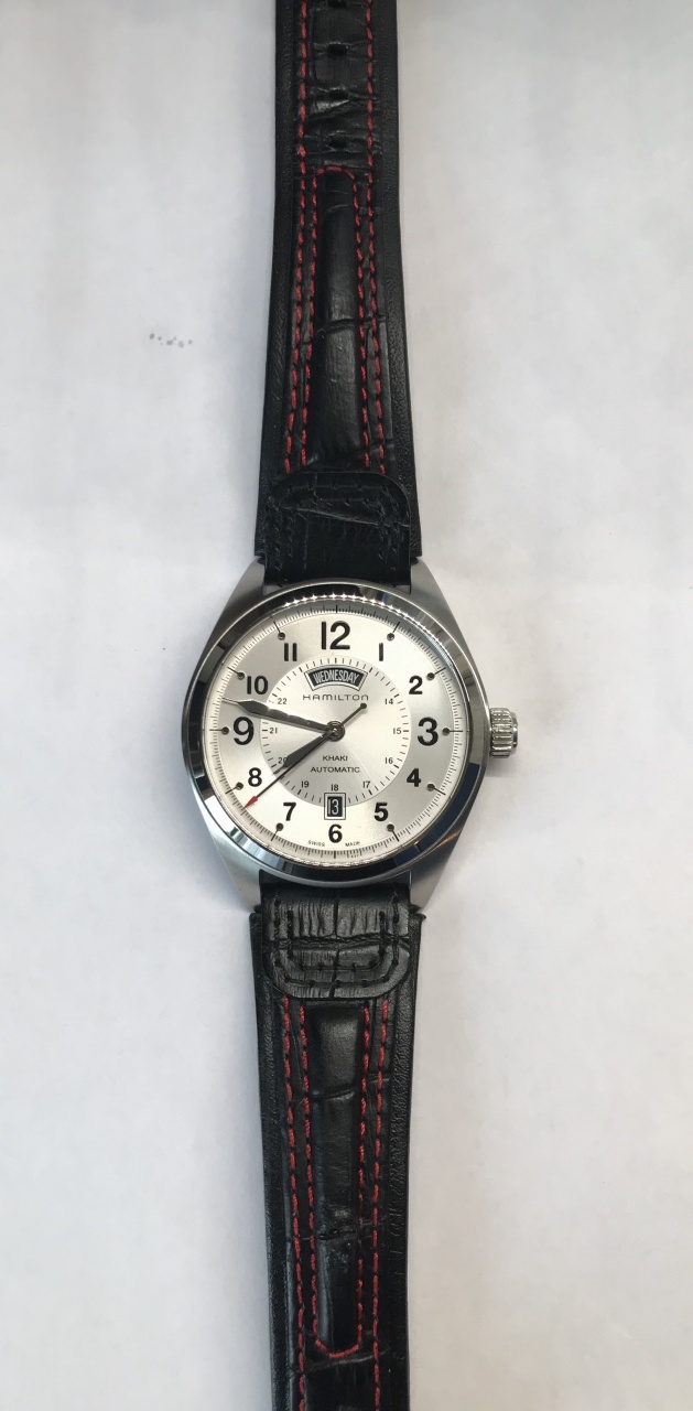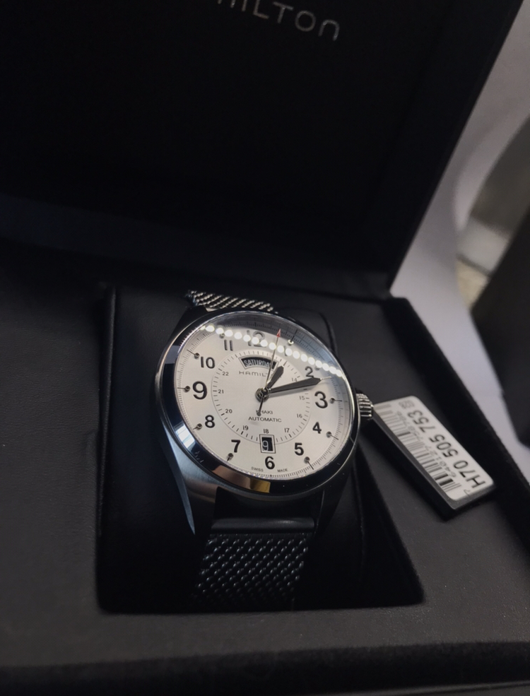 Шикарные Hamilton с усложнением в виде дня недели, по разумной цене. Дата и день недели переводятся мгновенно, не стоит ждать несколько минут и смотреть на вяло ползущую дату. Задняя крышка со вставкой из сапфирового стекла, сквозь которое можно наблюдать за работой шикарного, надежного, точного механизма ETA 2834-2. Корпус часов сатинированный (царапинки не так страшны), безель глянцевый. Внешний круг циферблата имеет гильошь в виде концентричных кругов.