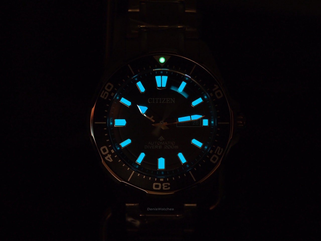 Голубой люм на стрелках и метках, а точка на безеле зеленого цвета