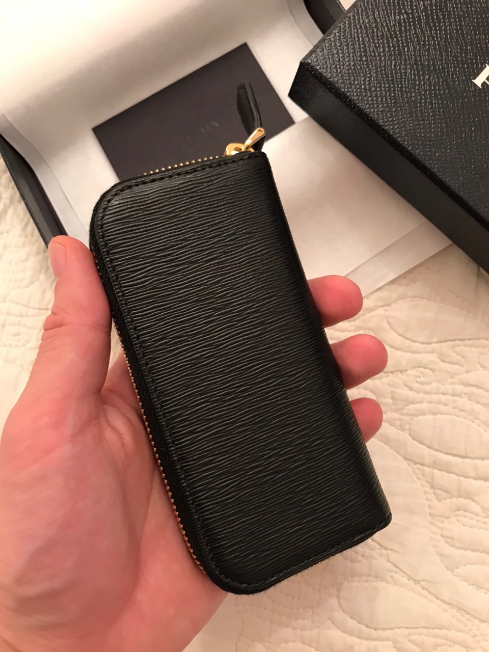 Кожа выделки «Vitello move» (очень похожа на кожу Epi от Louis Vuitton), очень ноская и стойкая к царапинам. Цвет - черный (Nero). Размер очень редкий удобный - 14 см на 7 см, влезут даже длинные ключи.