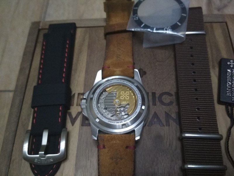 В комплекте два доп. ремешка, черный безель и шикарная деревянная коробка.