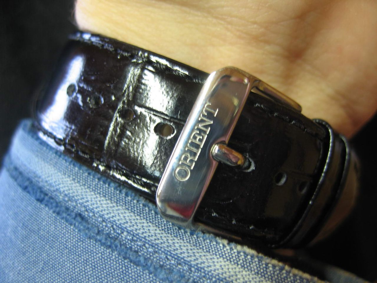 Кожаный ремень длиной 250 мм, и шириной 20 мм, изготовлен из натуральной кожи и имеет два разных покрытия. Верхний влаго отталкивающий, черный, блестящий, внутренний мягкий и гладкий, наоборот впитывающий. Пряжка замка титановая, полированная. На пряжке выдавлено слово ORIENT.