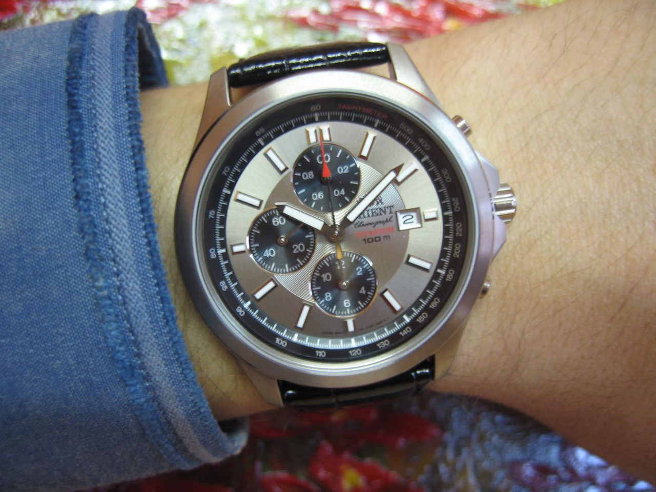 Справа на цифре 3, имеется число месяца, в окантовке из блестящей рамки. Там же имеются надписи Orient, Chronograph, Titanium, 100m. Внизу циферблата имеется микро шрифт Japan Movt и коды корпуса и циферблата.