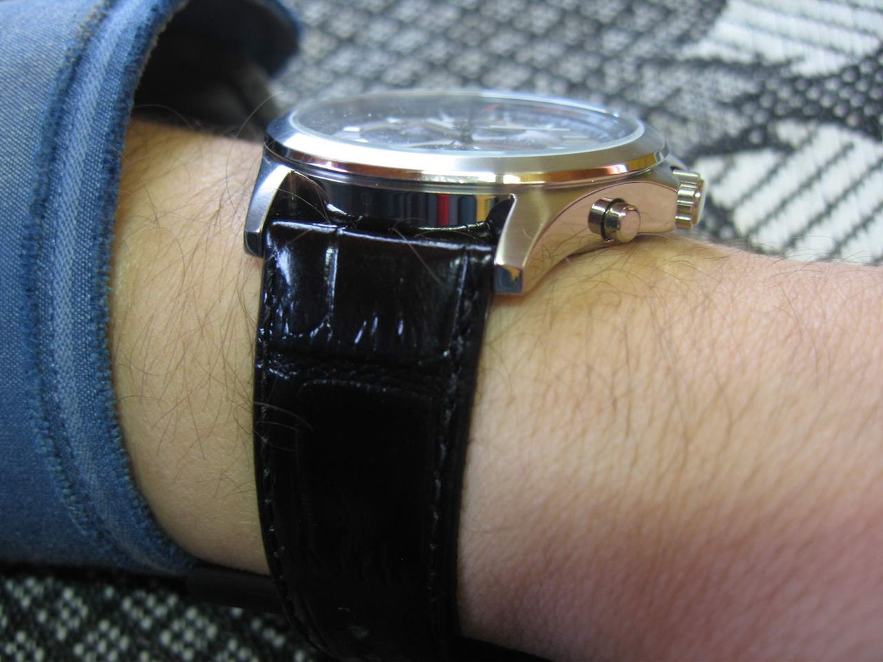 Как уже упоминалось выше, серый циферблат особенно хорошо смотрится на браслете. С черной кожей он тоже смотрится неплохо, но серый браслет лучше. Стандартный набор из трех микроциферблатов - слева обычные секунды (секунды в хрометре считает центральная секундная стрелка), вверху миллисекунды хронометра, внизу минуты и часы хронометра. Фон микроциферблатов контрастирует с основным цветом циферблата. Так, если циферблат серый, то микроциферблаты черные и наоборот. Также микроциферблаты имеют обработку в виде концентрических окружностей, а их границы имеют блестящую окантовку. Стрелки микроциферблатов стальные. Пересекаясь с микроциферблатами, в центре основного циферблата есть отделка концентрическими кругами. Поверхность под индексами матовая. Индексы имеют блестящее основание и покрыты люминесцентным составом. По окружности циферблата нанесена шкала тахиметра, которая позволяет замерять пройденное расстояние (начиная со скорости в 60 км/час), и замерять, к примеру, производительность рабочего в час. Основные минутная и часовая стрелки мечеобразной формы, с люминесцентным составом по всей длине. Центральная стрелка предназначена для отсета секунд хронометра, и имеет красный наконечник.