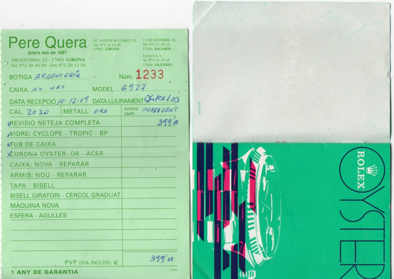 Последний раз часы обслужены в 2009 году у официального дистрибьютора Ролекс "РereQuera 1887", в Испании, Жирона.